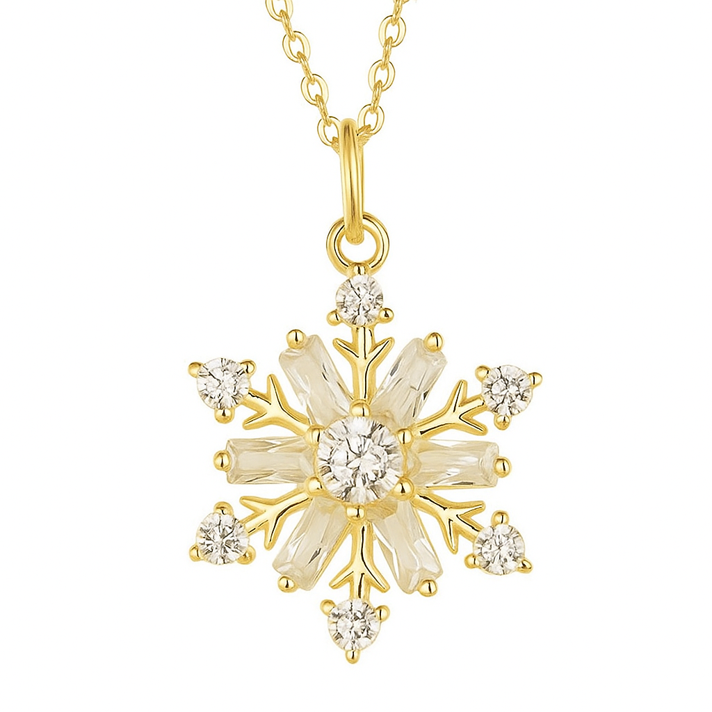 A shimmering ode to Christmas winter’s poetry, this pendant evokes the serenity of snow descending beneath a star-lit sky. Its intricate snowflake silhouette is adorned with radiating brilliance, balancing bold geometry with delicate craftsmanship. Resting gracefully on a fine chain, the pendant reflects purity and wonder, making it an enchanting keepsake for the woman who treasures beauty that feels both fleeting and eternal.
