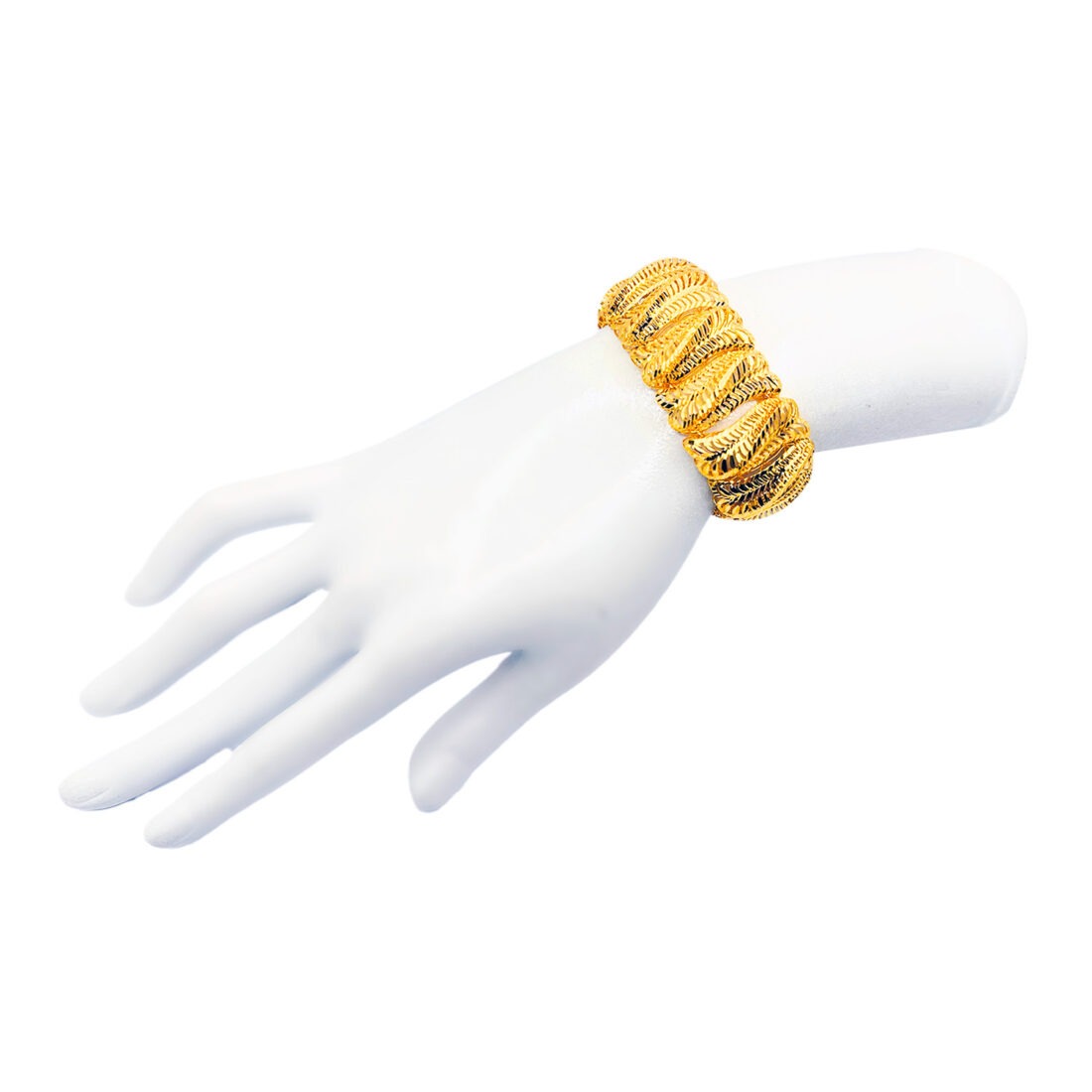Expertly crafted in fine gold, every detail of the leaf patterns is highlighted with precision cuts and polished surfaces that gleam under the light. Comfortable to wear yet visually striking, this bracelet is ideal for those who appreciate jewellery that carries meaning as well as elegance. Worn alone, it makes a powerful statement of individuality; layered with other bangles, it becomes part of a bold, fashion-forward ensemble.