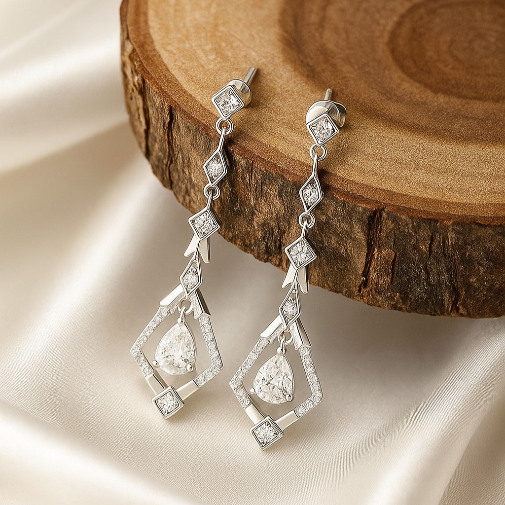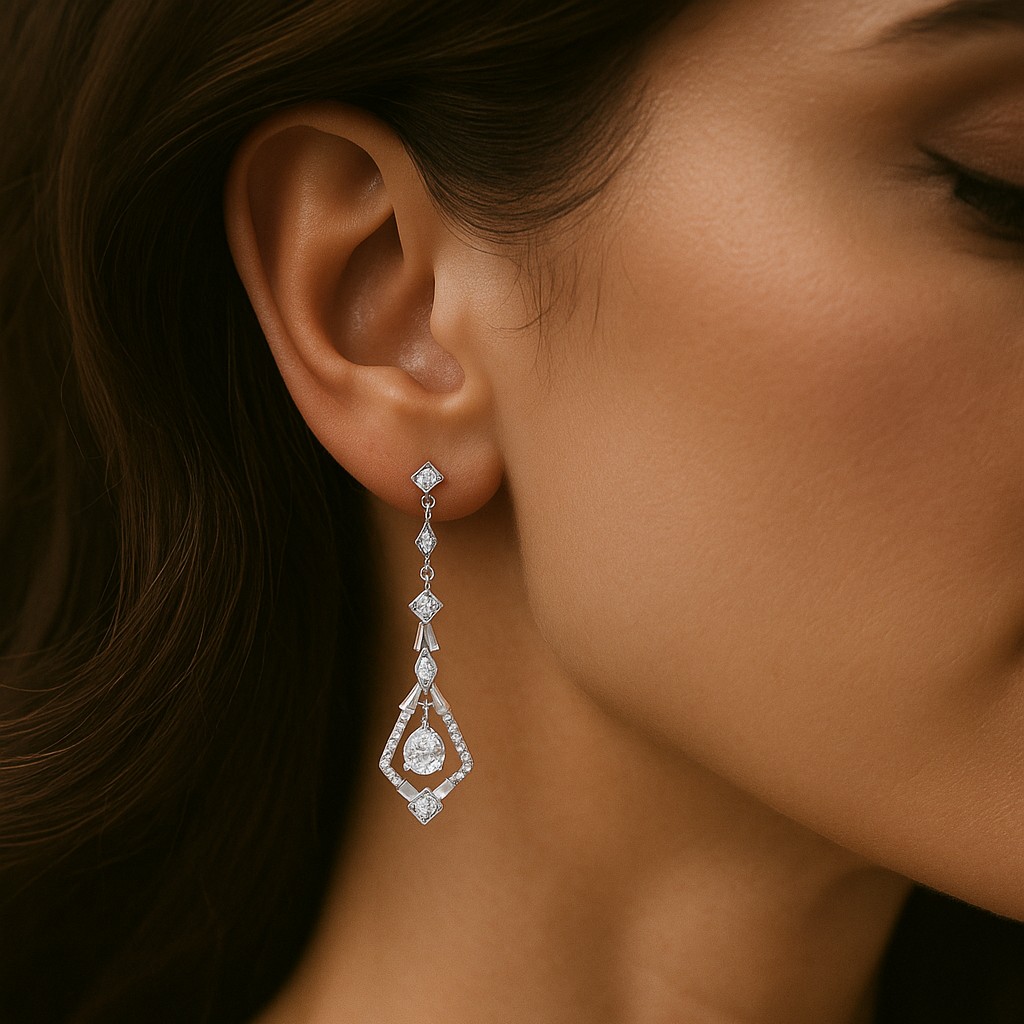 Geometric precision meets fluid elegance in these elongated diamond drops. Set with intricate artistry, the cascading shapes frame a central pear-cut diamond, a masterpiece of symmetry and modern vintage glamour.