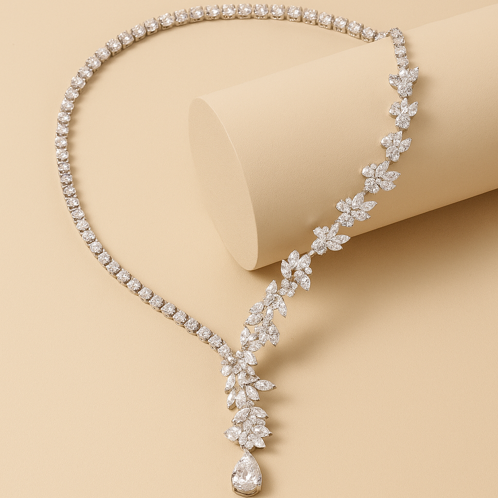 • A celebration of elegance in motion, this necklace cascades with asymmetric brilliance, where leaf-like stones trace one side in organic rhythm, converging into a luminous teardrop centerpiece. It embodies the poetry of nature — the balance of wild beauty and refined sophistication. Designed for the woman who walks with quiet strength yet dazzles with presence, this necklace radiates with emotional depth, making it the perfect companion for life’s most cherished occasions.