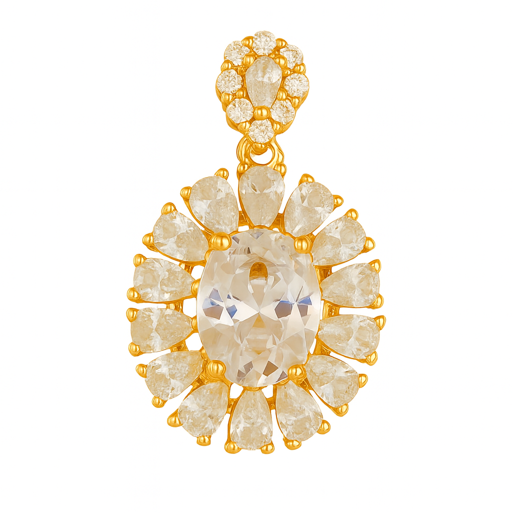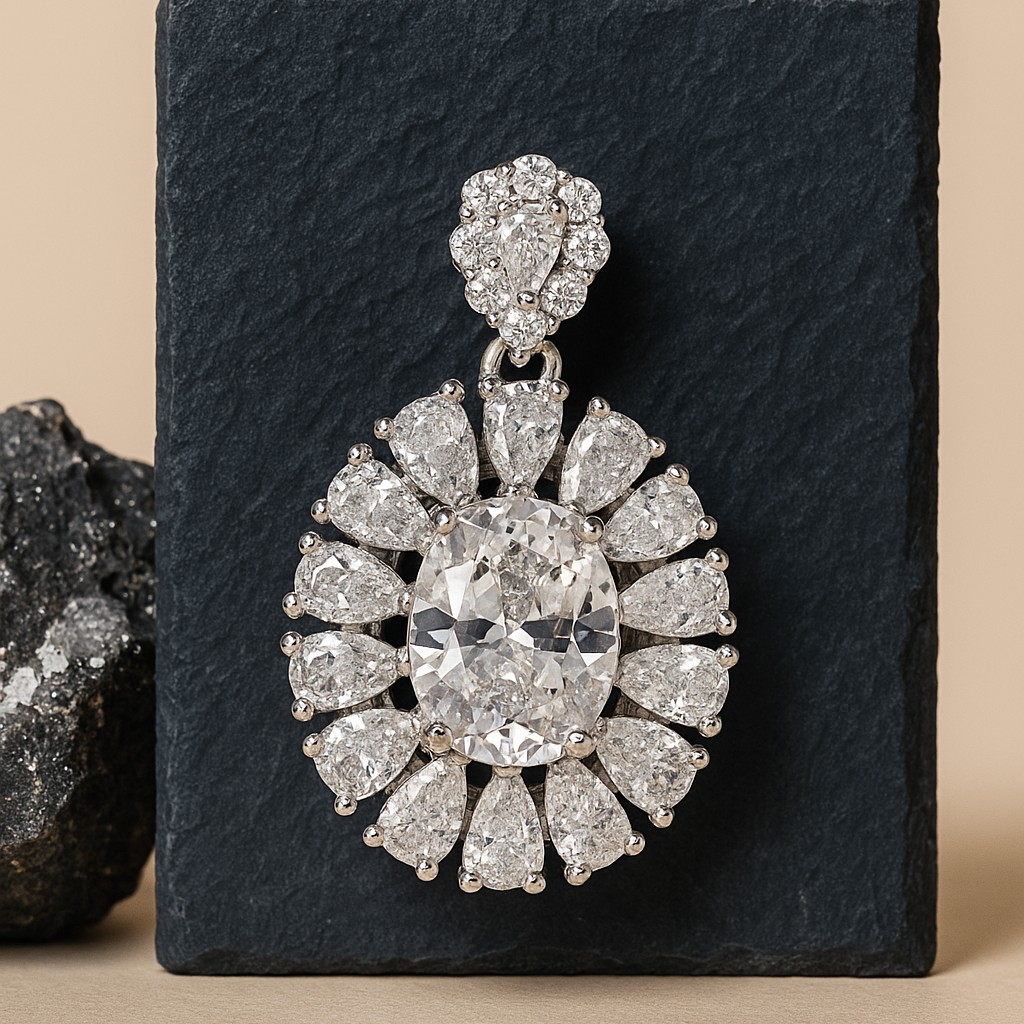 Suspended in perfect symmetry, the Aurora Blaze pendant is a luminous emblem of beauty and grace. The central diamond, embraced by a sunburst of surrounding stones, symbolizes strength and renewal, making it more than jewellery — it is a talisman of vitality. Worn close to the heart, it glimmers with sophistication and sentiment.