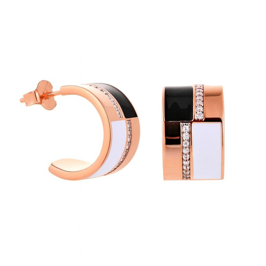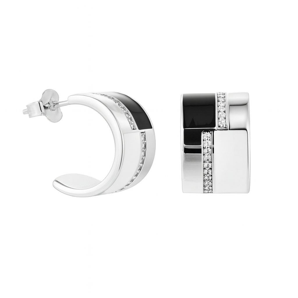 18k white, rose, or yellow gold with VS1 diamonds and black & white enamel A bold interplay of geometry, color, and light, these hoops juxtapose panels of black and white enamel with a stream of pavé-set diamonds. A contemporary vision of elegance, they capture the artistry of modern design while radiating the eternal beauty of gold and diamonds. Striking yet versatile, they reflect the sophistication of a woman unafraid to stand apart.