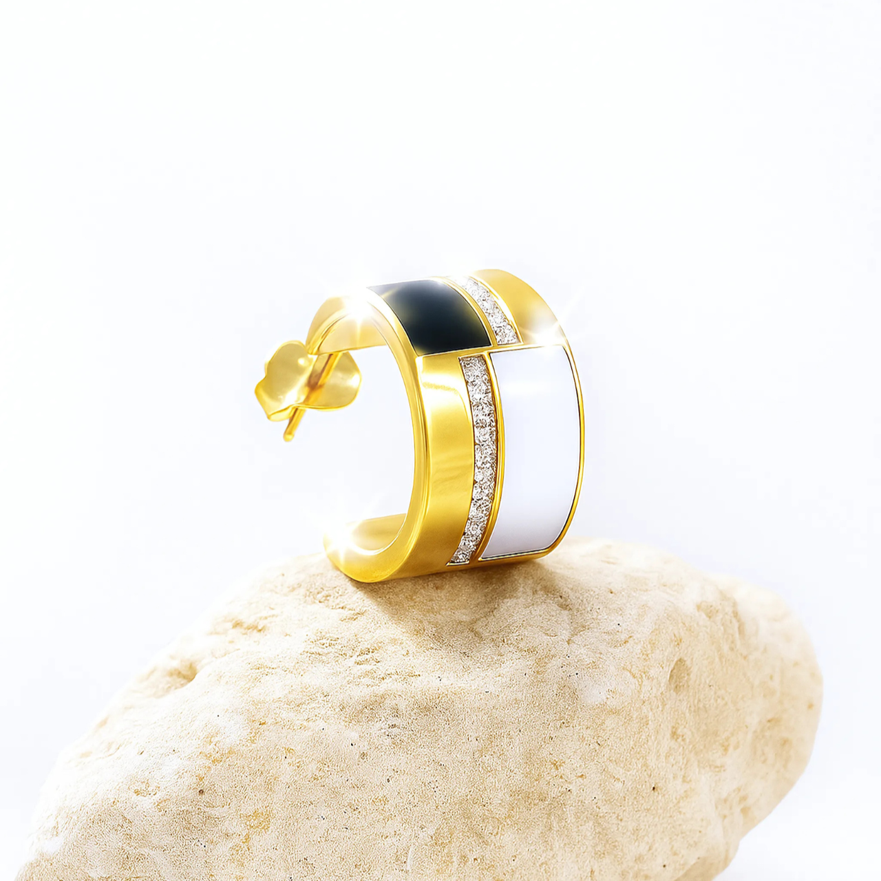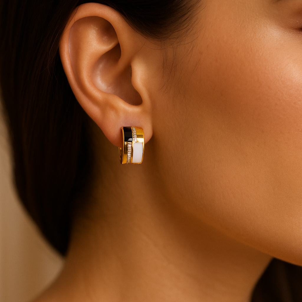 A bold interplay of geometry, color, and light, these hoops juxtapose panels of black and white enamel with a stream of pavé-set diamonds. A contemporary vision of elegance, they capture the artistry of modern design while radiating the eternal beauty of gold and diamonds. Striking yet versatile, they reflect the sophistication of a woman unafraid to stand apart.