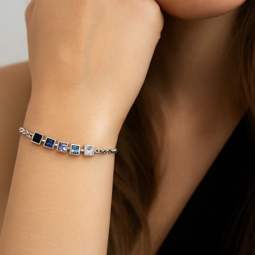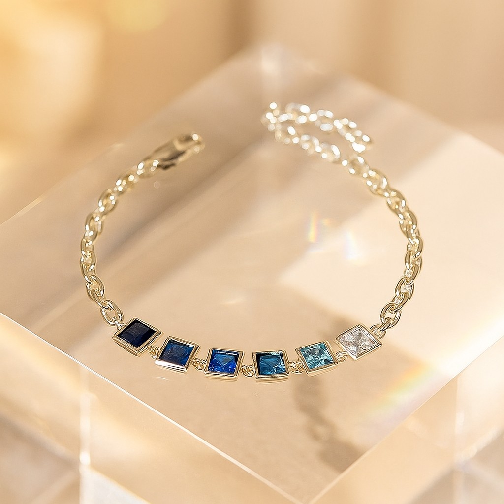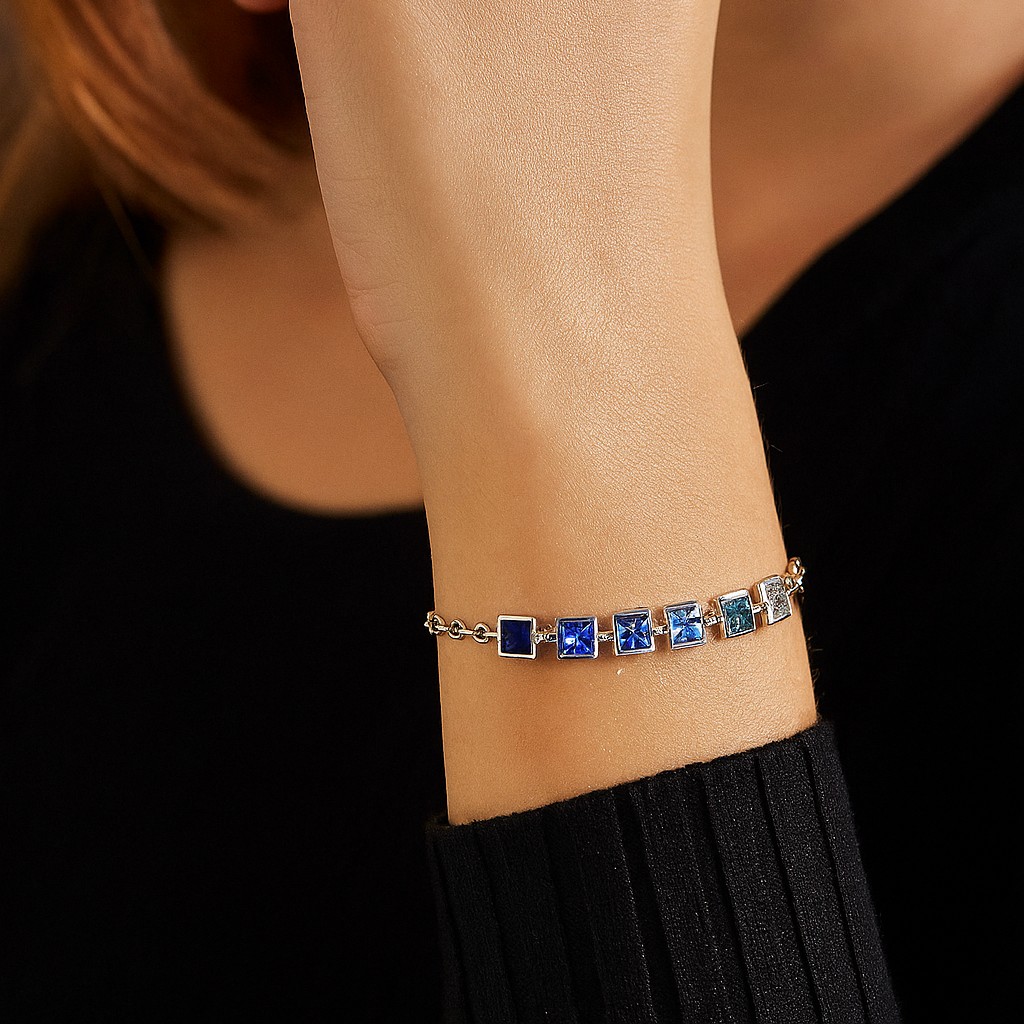 A gradient of square-cut gemstones flows from deep midnight to light ocean blue. The cascade of color mirrors waves on an endless horizon, modern and refreshing in spirit. This bracelet is for the confident collector — bold in design, versatile in style, and timeless in allure.