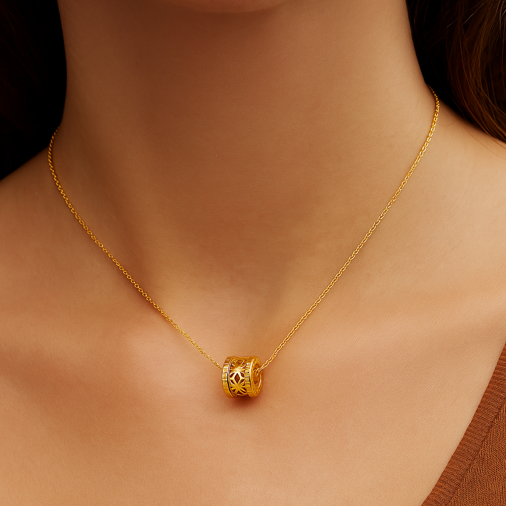 • Crafted from 2.60 grams of pure gold, the Baby Love Filigree Gold Pendant is a delicate fusion of warmth and sophistication. Its 8mm cylindrical design features intricate openwork patterns and the engraved words BABY LOVE, symbolizing affection that endures through time. With a 4mm loop for versatile wear, this pendant shines as a modern token of devotion — refined, heartfelt, and irresistibly elegant.