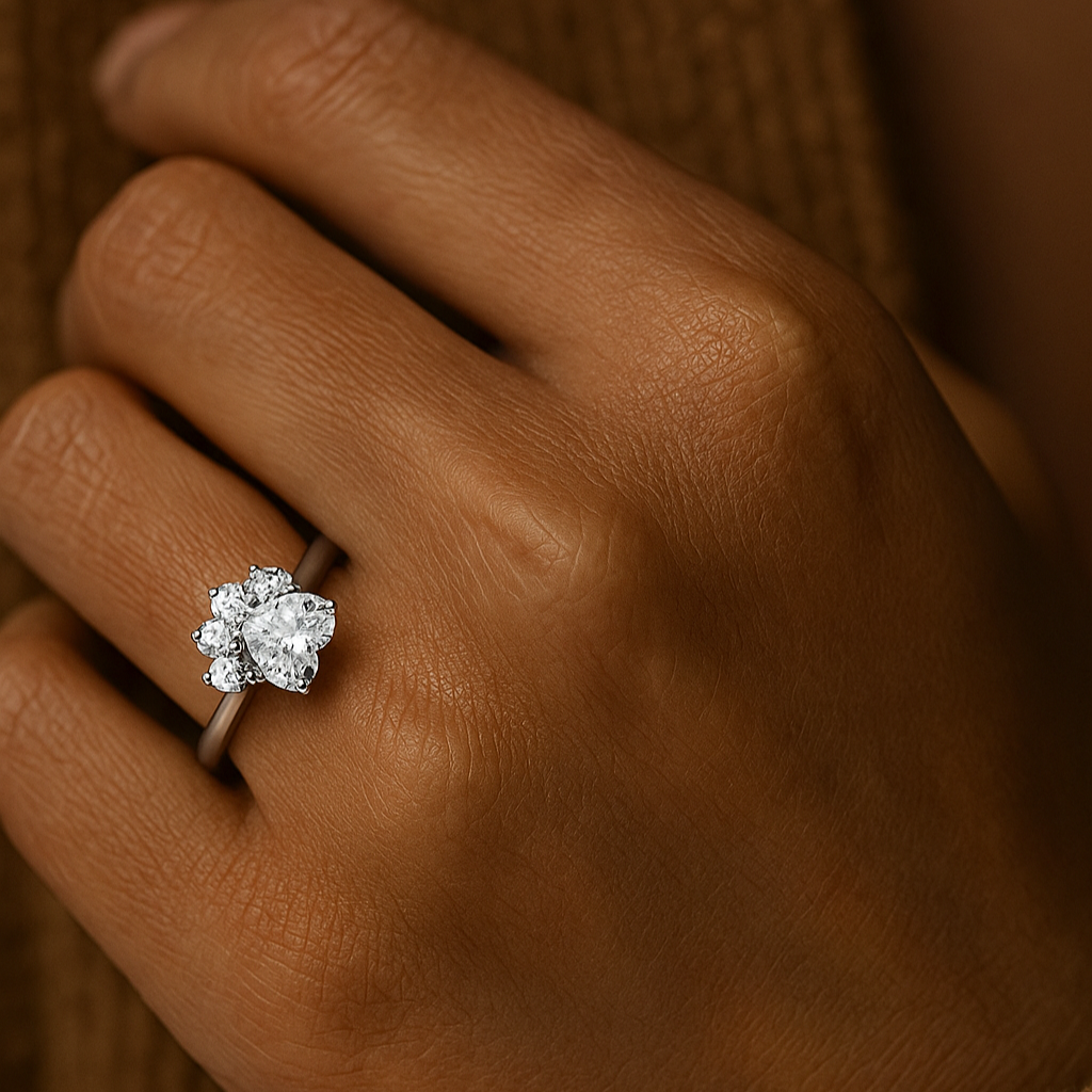 Six radiant diamonds cluster around a central stone, forming a floral silhouette that blooms with brilliance. This ring symbolizes renewal, promise, and love in full blossom — a timeless treasure of delicate beauty.