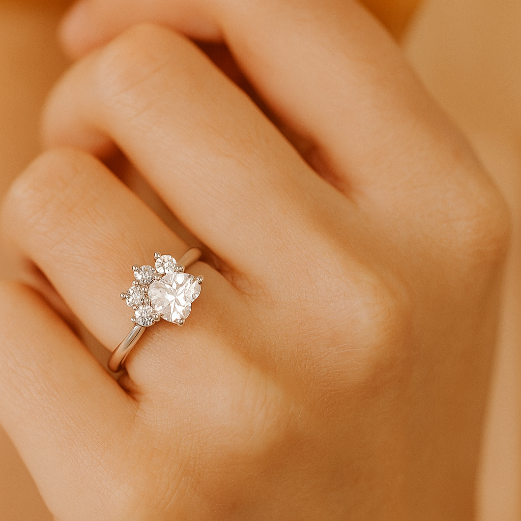 18k white, yellow, or rose gold with VS1 diamonds Six radiant diamonds cluster around a central stone, forming a floral silhouette that blooms with brilliance. This ring symbolizes renewal, promise, and love in full blossom — a timeless treasure of delicate beauty.
