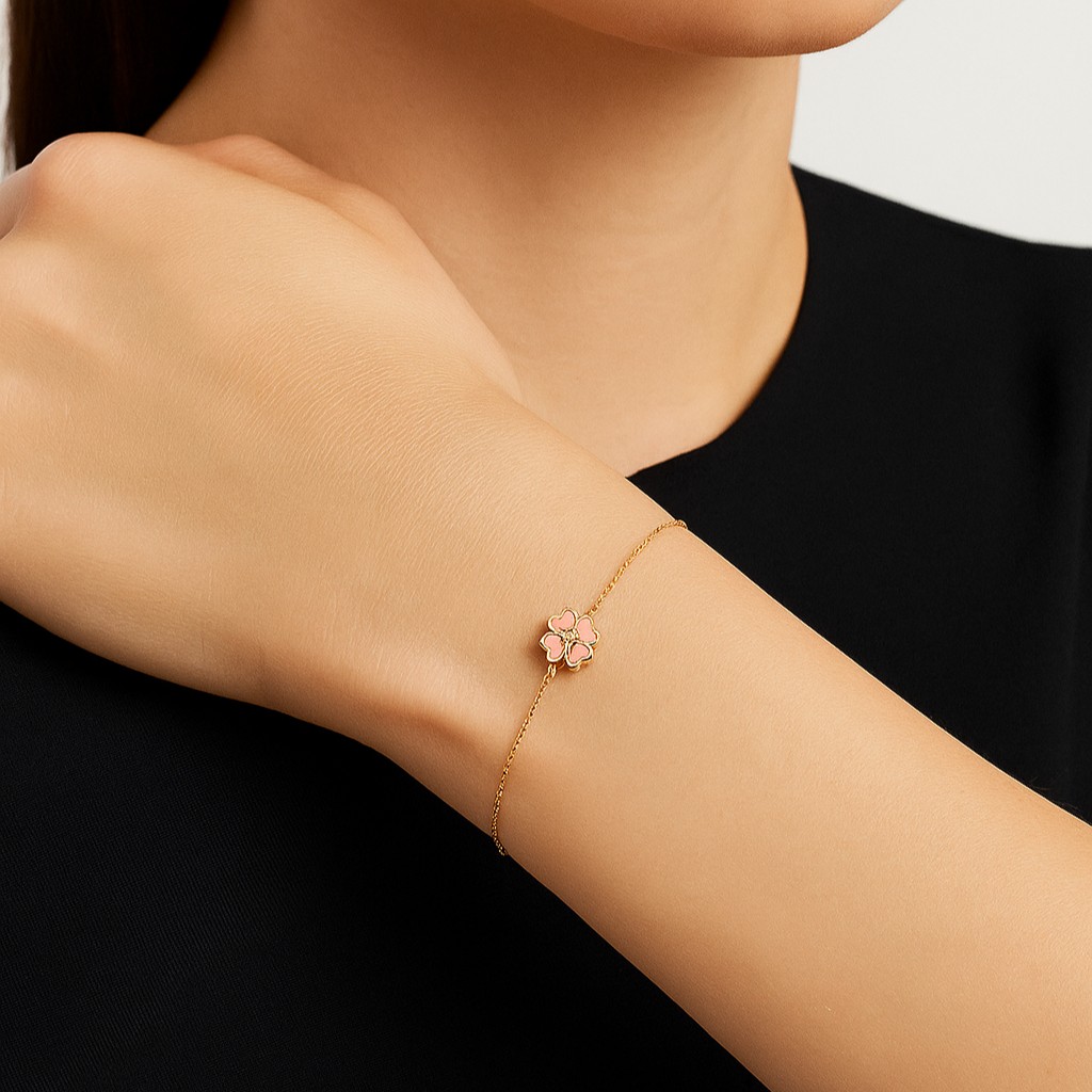 A radiant 916 gold charm adorned with soft pink and white enamel petals, symbolizing grace, love, and new beginnings.