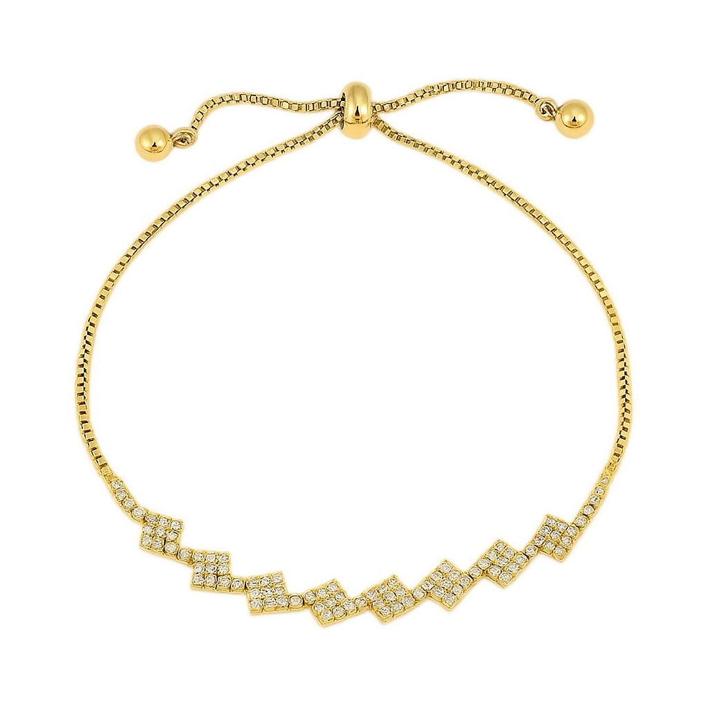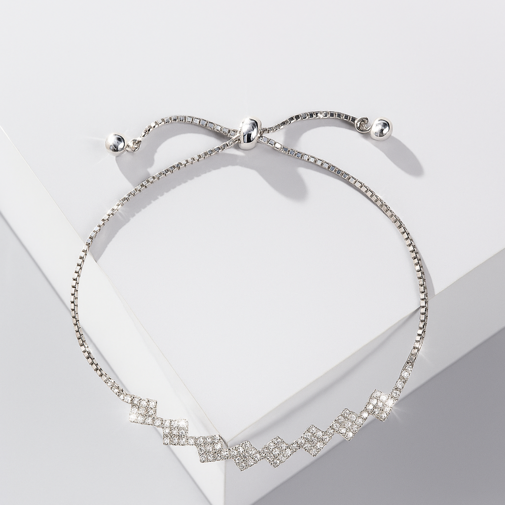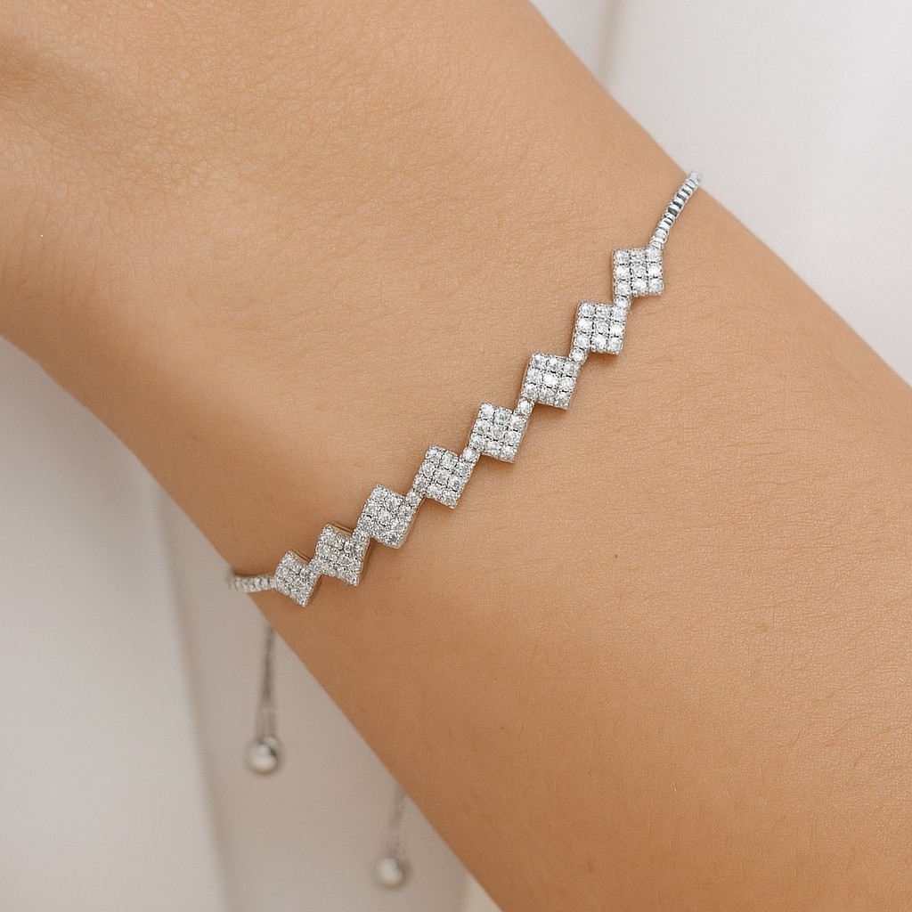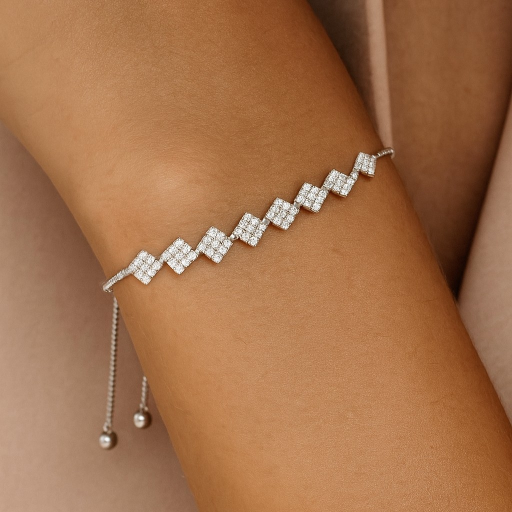 A modern ode to geometry, this bracelet features a flowing succession of diamond-studded squares, each angled to catch light in rhythmic harmony. The piece embodies strength and grace, ideal for the woman who commands elegance effortlessly.