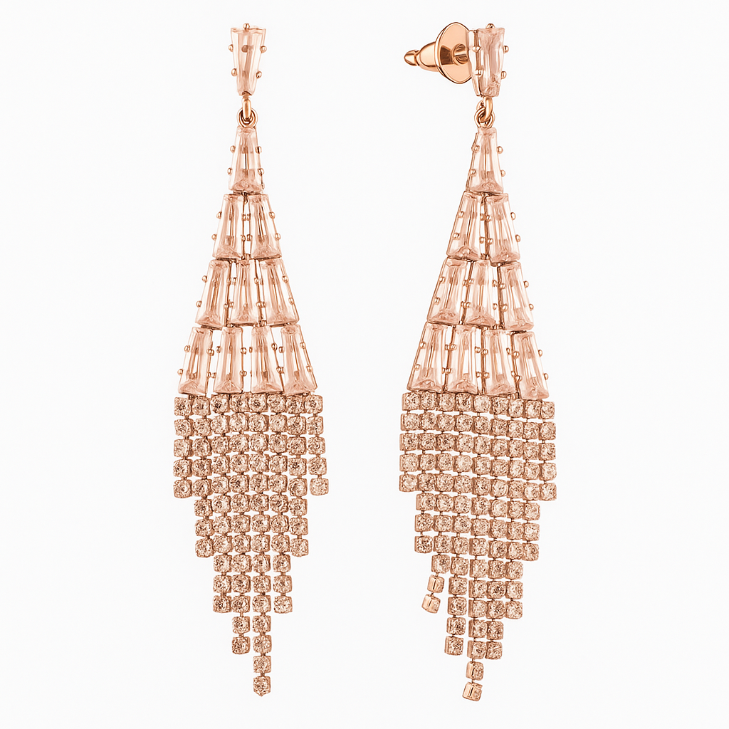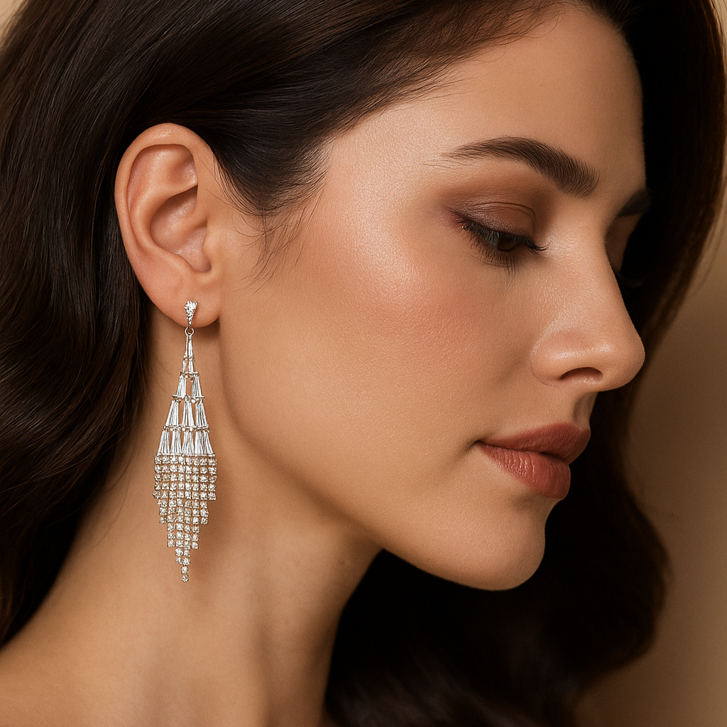 A symphony of light and movement, these chandelier earrings cascade in streams of dazzling VS1 diamonds. Radiant and dramatic, they capture the glamour of a grand evening, each movement echoing the rhythm of elegance and allure.