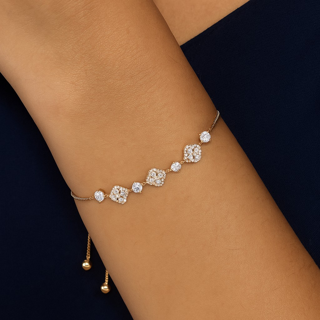 • Clusters of diamonds bloom like celestial flowers, radiating soft brilliance from a golden embrace. The alternating clusters create a dance of light, echoing spring’s delicate renewal. Elegant yet playful, this bracelet carries both romance and sophistication, destined to become a treasured everyday luxury.