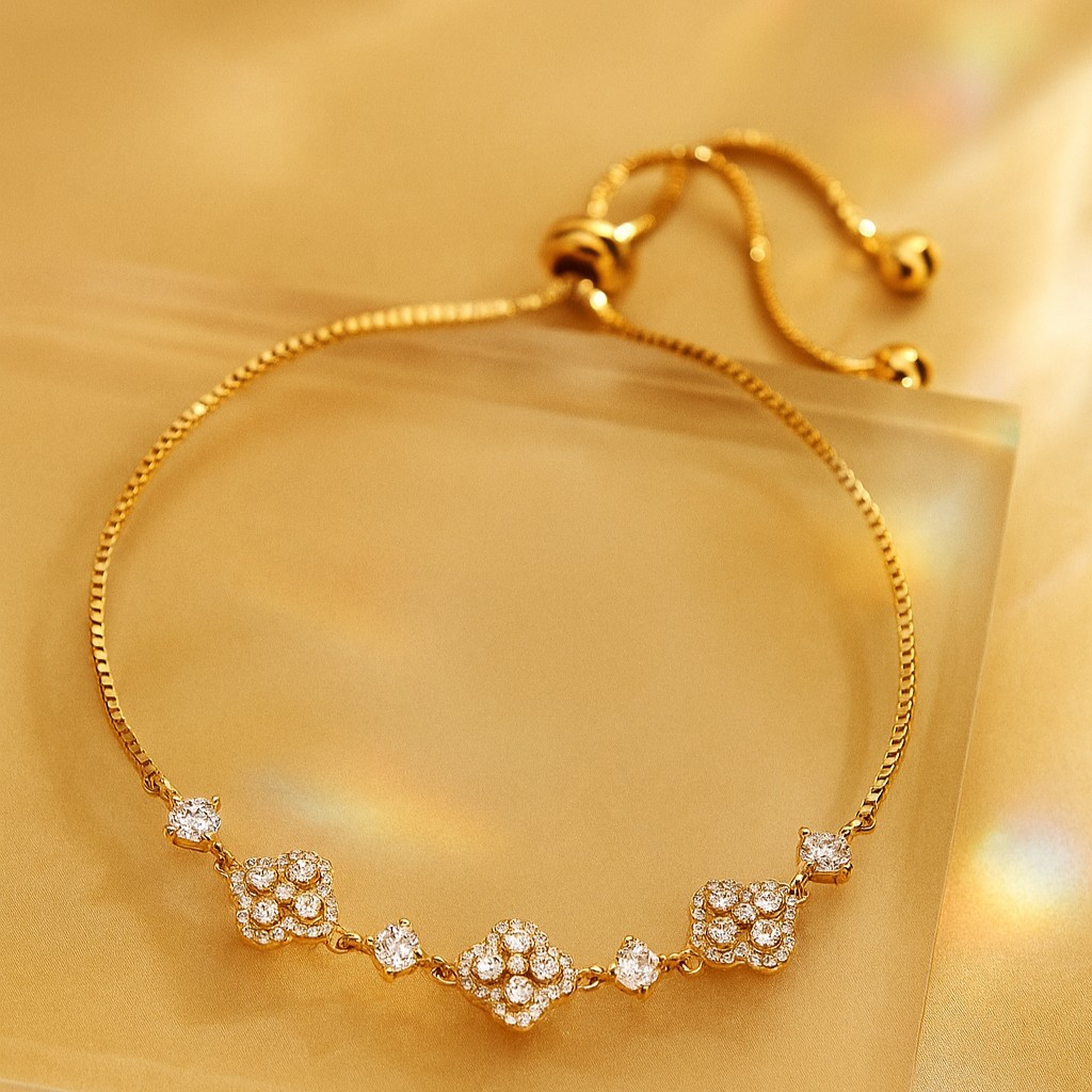 Clusters of diamonds bloom like celestial flowers, radiating soft brilliance from a golden embrace. The alternating clusters create a dance of light, echoing spring’s delicate renewal. Elegant yet playful, this bracelet carries both romance and sophistication, destined to become a treasured everyday luxury.
