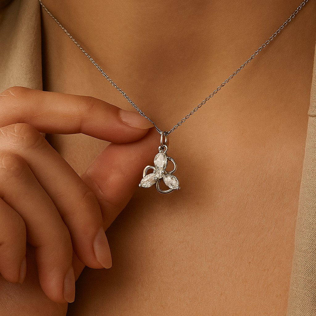 The pendant embodies a soft yet radiant allure, with three marquise-cut diamonds forming the petals of a stylized floral motif. Gracefully interwoven gold lines enhance the sense of movement, while a central diamond sparkles as the heart of the bloom. This pendant rests close to the heart, carrying with it the symbolism of natural grace, growth, and quiet strength.