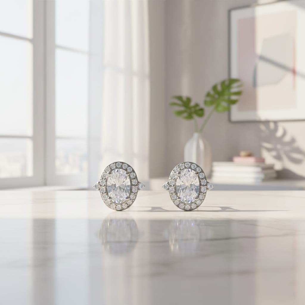 Designed to frame the face with subtle luminosity, these stud earrings feature oval diamonds encircled by delicate halos, offering dimension and sparkle from every angle. Their versatile elegance makes them equally fitting for daily wear and treasured occasions.