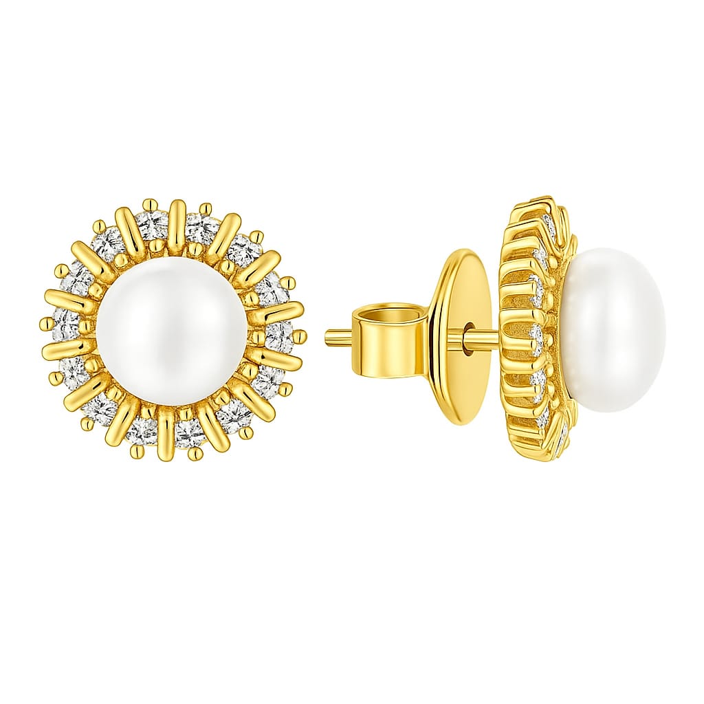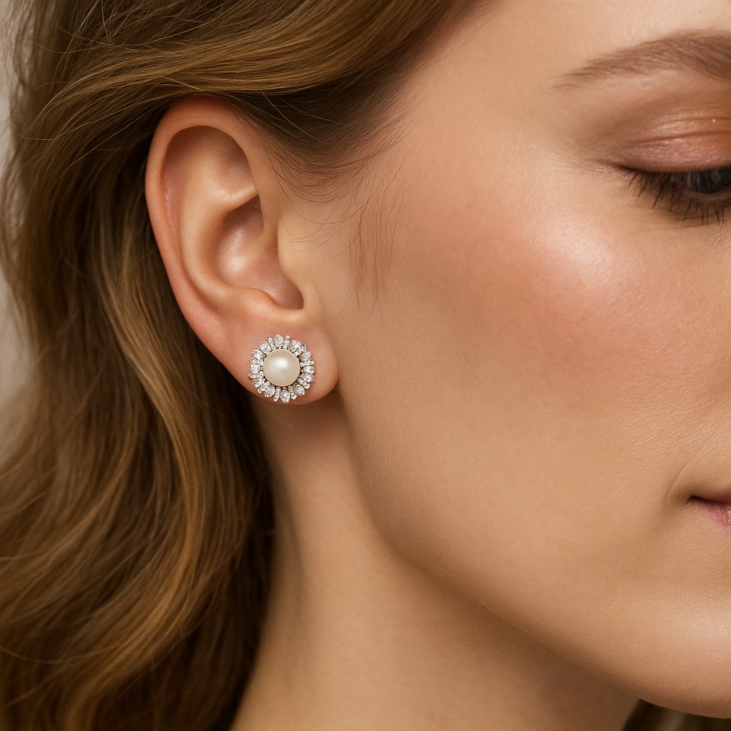 A luminous pearl surrounded by a halo of radiant diamonds, evoking the image of a star crowned by its constellation. The Celeste Pearl earrings capture celestial beauty and timeless charm, blending softness and sparkle in perfect harmony.