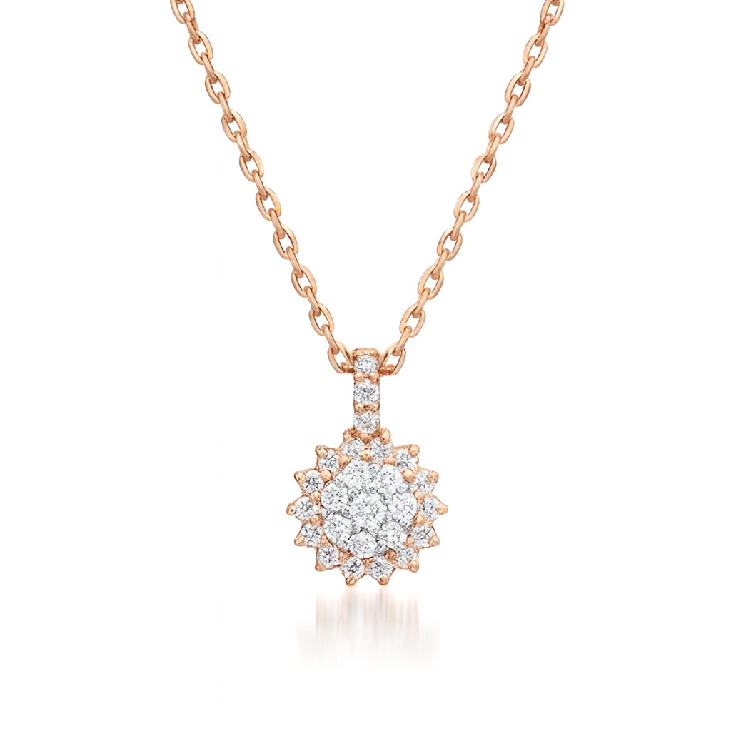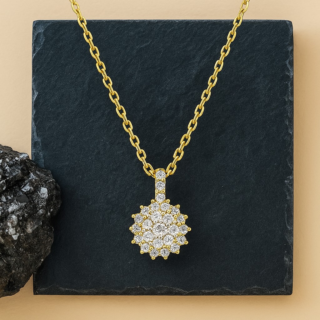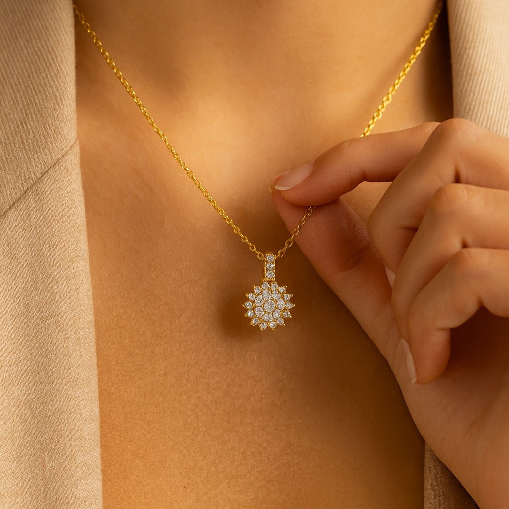 • A starburst of diamonds surrounds a customizable central gem, creating the aura of a sunrise captured in gold. Every angle reveals brilliance—like light breaking over the horizon. A pendant for dreamers, visionaries, and eternal optimists.