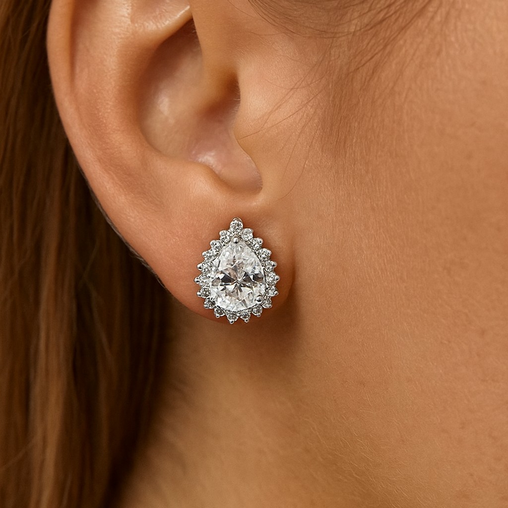 • These dazzling studs feature pear-shaped center stones encircled by a sparkling halo, designed to catch the light with every movement. Sophisticated yet versatile, they transition seamlessly from everyday elegance to evening glamour.