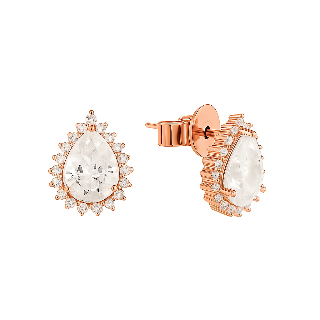 These dazzling studs feature pear-shaped center stones encircled by a sparkling halo, designed to catch the light with every movement. Sophisticated yet versatile, they transition seamlessly from everyday elegance to evening glamour.