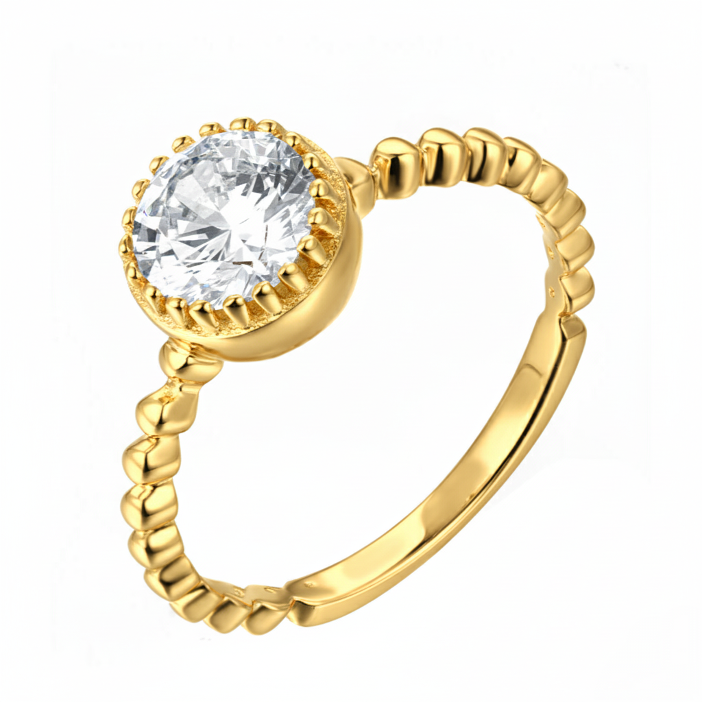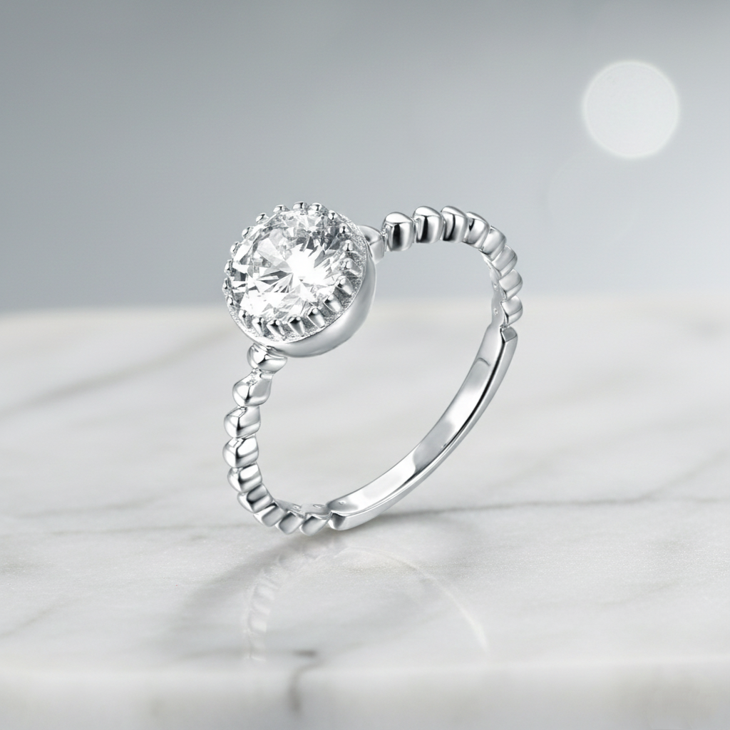 A luminous round diamond glows in a sleek bezel crown, cradled by a playful beaded band. Light dances across its polished rhythm, a perfect harmony of whimsy and refinement — a celebration of love that is as effortless as it is eternal