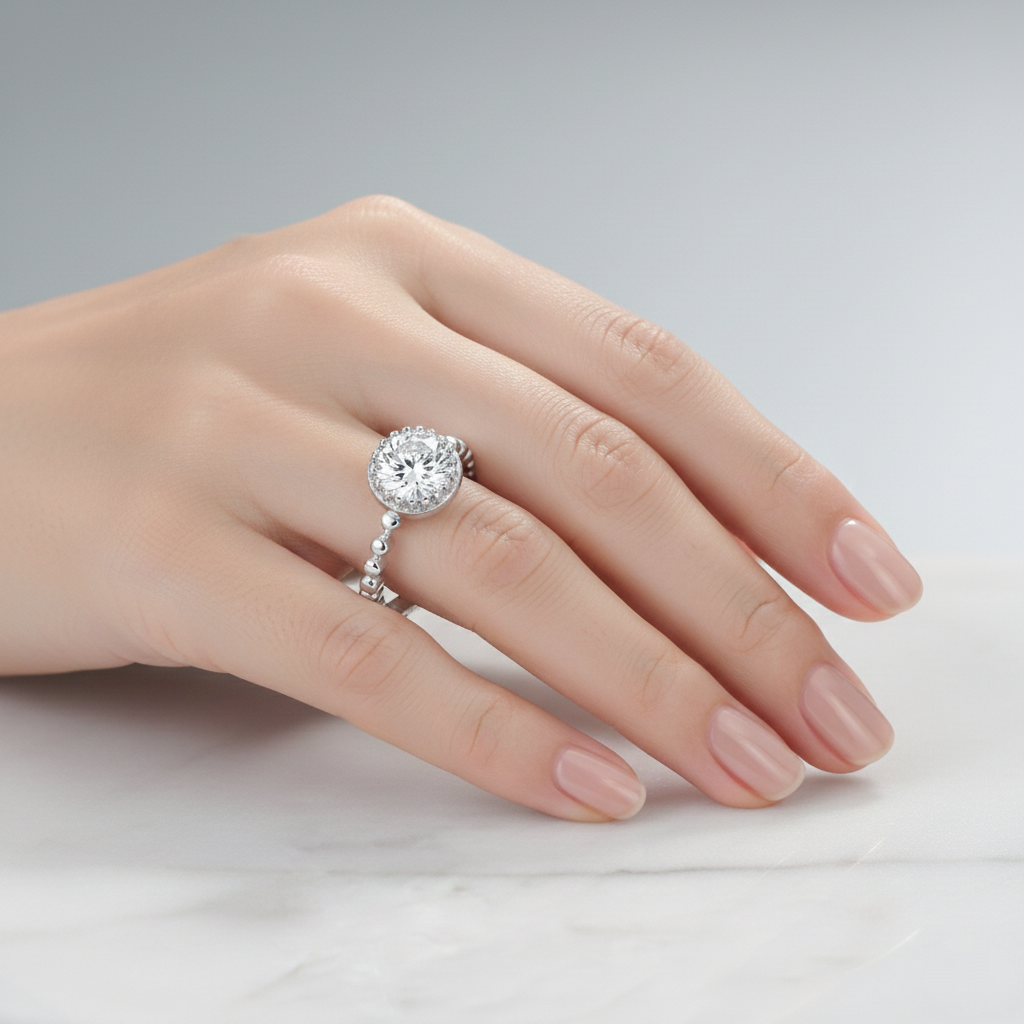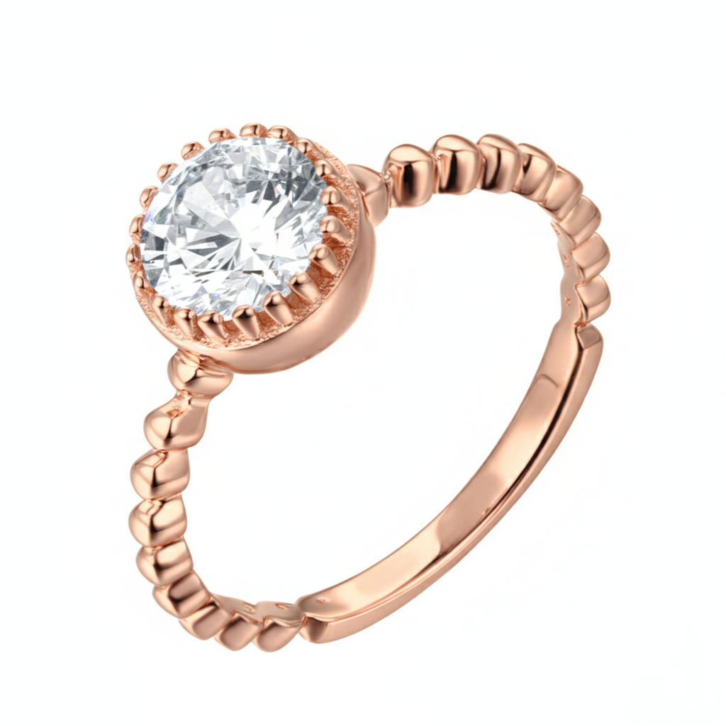 • A luminous round diamond glows in a sleek bezel crown, cradled by a playful beaded band. Light dances across its polished rhythm, a perfect harmony of whimsy and refinement — a celebration of love that is as effortless as it is eternal