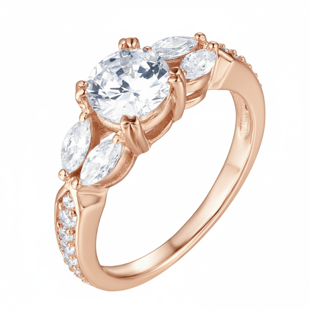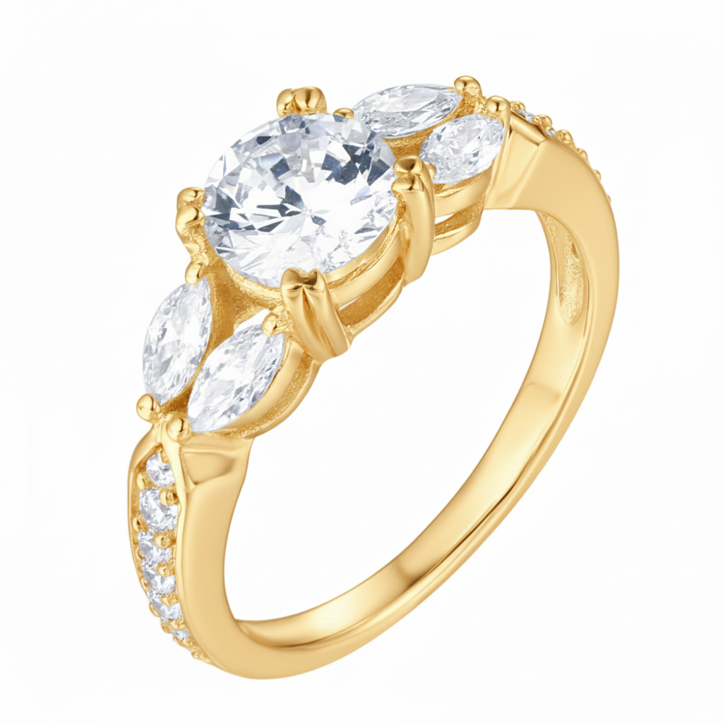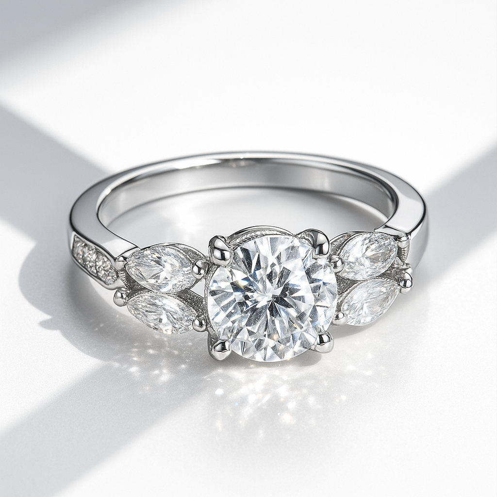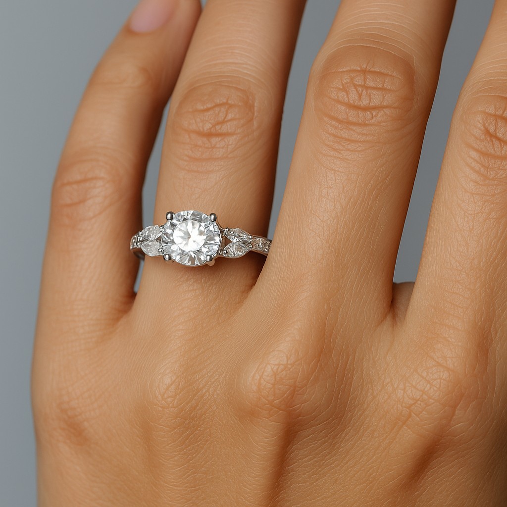 • A luminous round diamond blooms at the center, flanked by marquise-cut petals that radiate outward in dazzling symmetry. This design captures the splendor of a flower opening under starlight, a poetic dance of brilliance and grace.