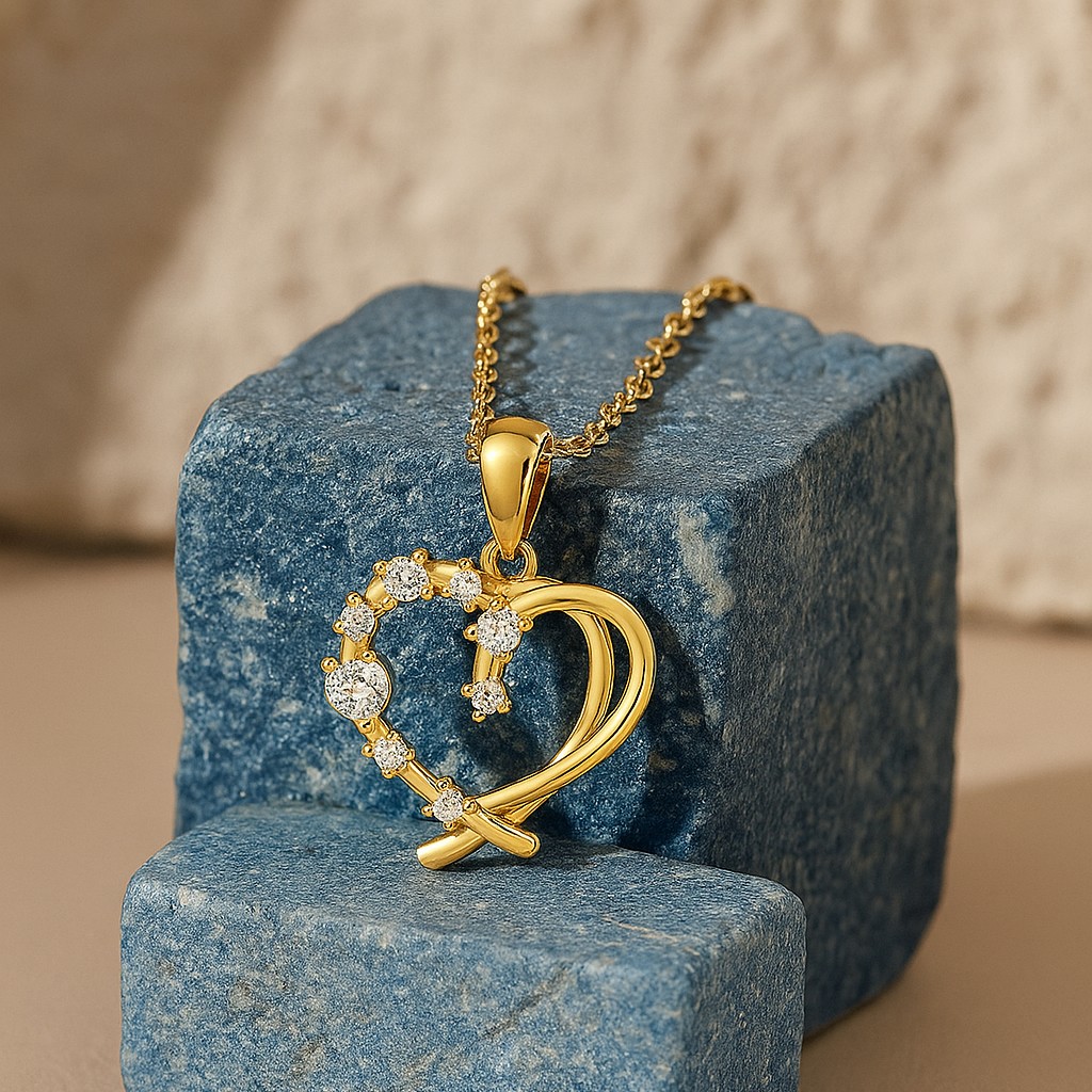 A delicate heart is traced with golden curves, cascading into sparkling VS1 diamonds that shimmer like falling stars. At its core, a customizable central gem radiates eternal brilliance. This pendant tells the story of love as a constellation — infinite, radiant, and destined to shine.