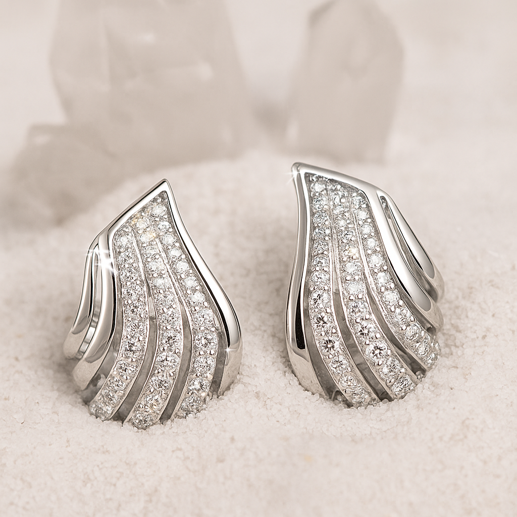 18k white, rose, or yellow gold with VS1 diamonds Sweeping arcs of pavé diamonds unfurl like wings in flight, sculpted in luminous gold. Bold yet refined, these earrings embody strength, aspiration, and the grace of freedom. Each curve mirrors the elegance of motion, designed for the woman who commands her path with quiet confidence and radiant presence.