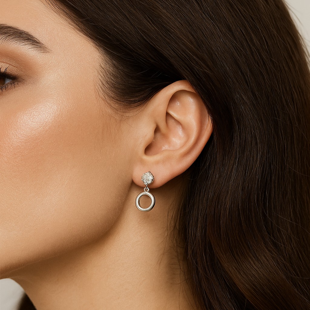 A solitaire stone anchors an elegant open circle, a symbol of wholeness and infinity. The Circle of Grace earrings celebrate both modern minimalism and eternal design, offering a refined yet playful allure.