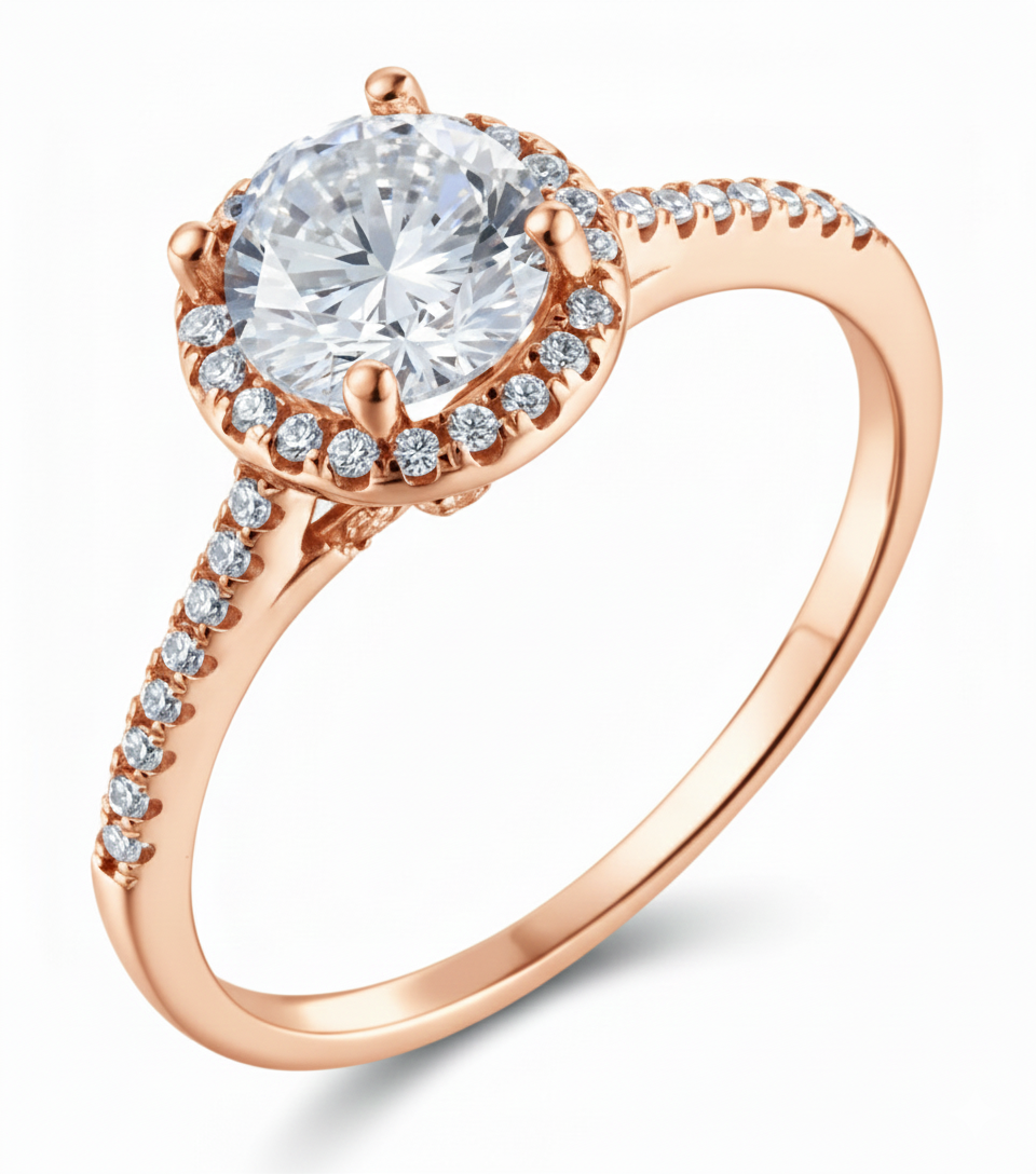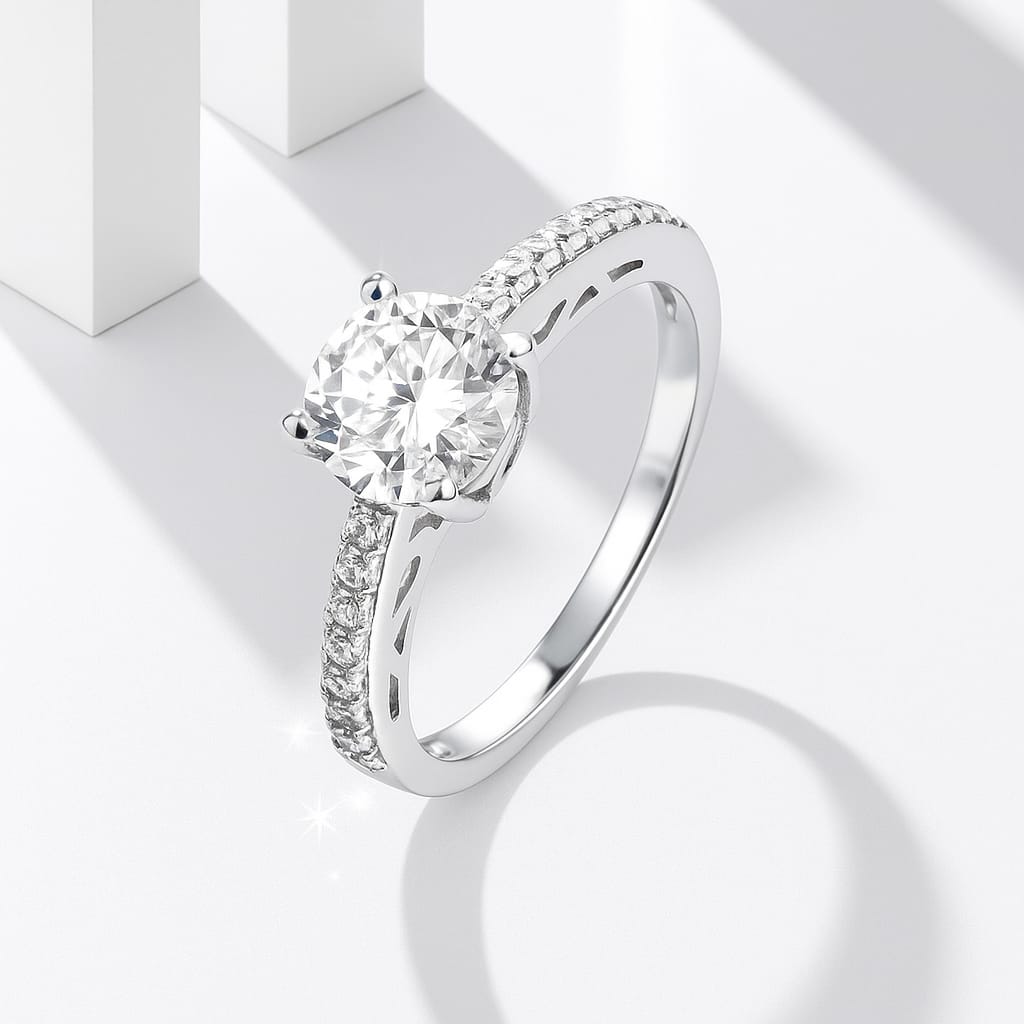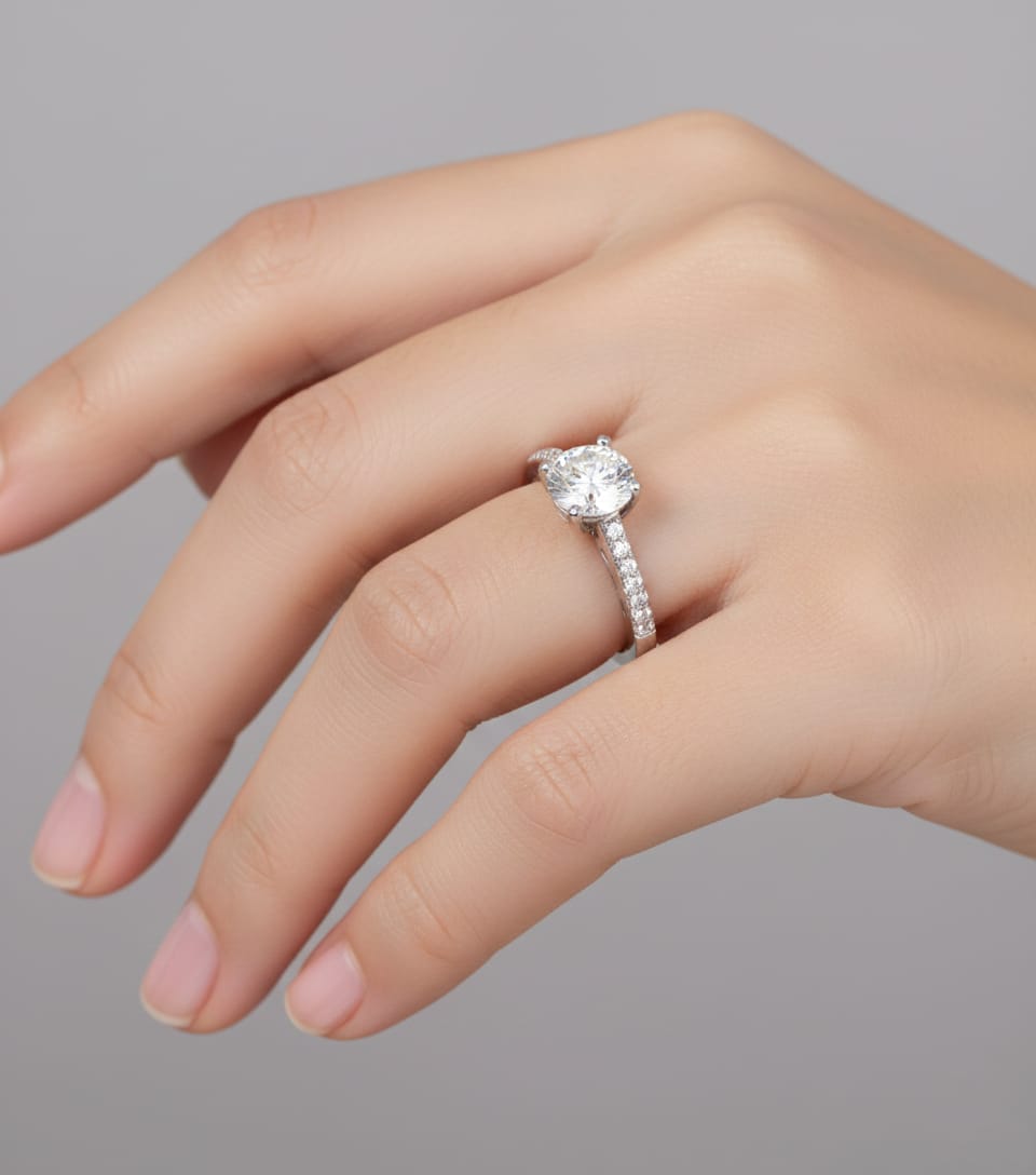 Four prongs hold a luminous round diamond at the heart of a clean pavé band. Its refined balance of brilliance and structure reflects unwavering commitment. This ring is the timeless choice, crafted for enduring love stories written in quiet confidence and elegance.