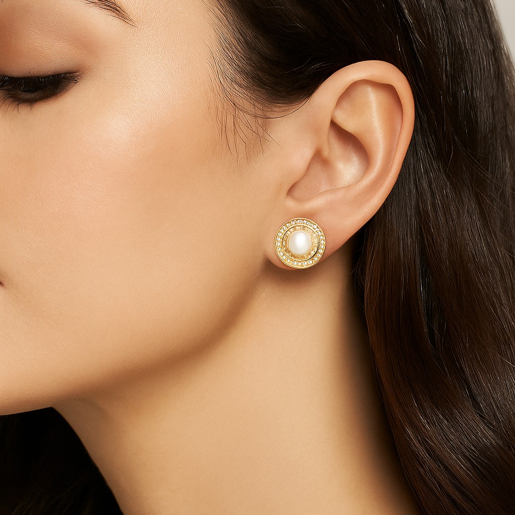 Encircled by concentric halos of VS1 diamonds, a luminous freshwater pearl takes center stage in these 18k gold earrings. Radiating eternal elegance, they embody both regal presence and understated grace—perfect for elevating every moment.