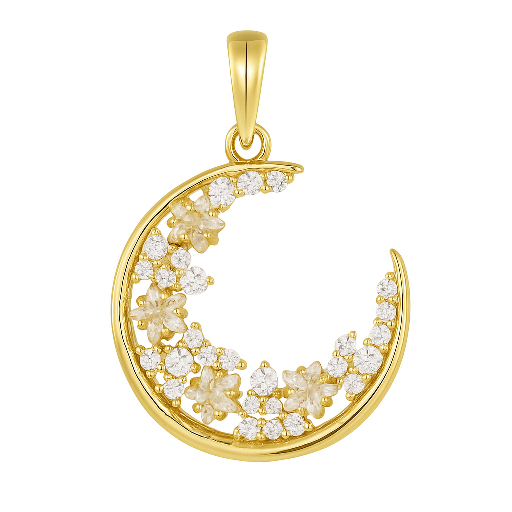 Mystical and romantic, this 18K gold pendant captures a crescent moon partially encrusted with VS1 diamonds, evoking the serene glow of moonlight. Available in white, yellow, or rose gold, it’s an enchanting piece for the dreamer at heart