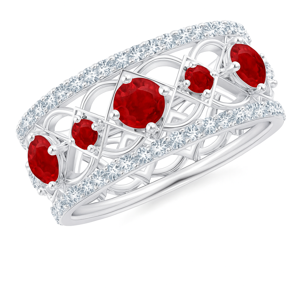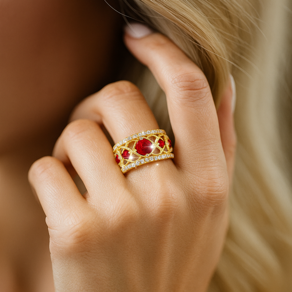 An extraordinary creation, this 18k gold openwork band is set with fiery rubies interlaced with pavé VS1 diamonds. Regal and commanding, it is a tribute to bold passion and timeless royalty — a piece that carries both majesty and intimacy in its design.