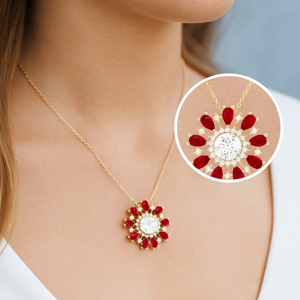 • A fiery halo of marquise rubies radiates outward like petals in full bloom, cradling a brilliant customizable central diamond. The VS1 accent diamonds add a celestial sparkle, reminiscent of stars dancing at twilight. A pendant that embodies passion, strength, and the warmth of eternal love.