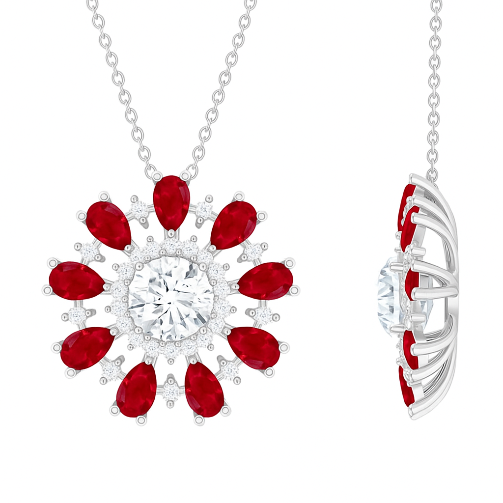 A fiery halo of marquise rubies radiates outward like petals in full bloom, cradling a brilliant customizable central diamond. The VS1 accent diamonds add a celestial sparkle, reminiscent of stars dancing at twilight. A pendant that embodies passion, strength, and the warmth of eternal love.