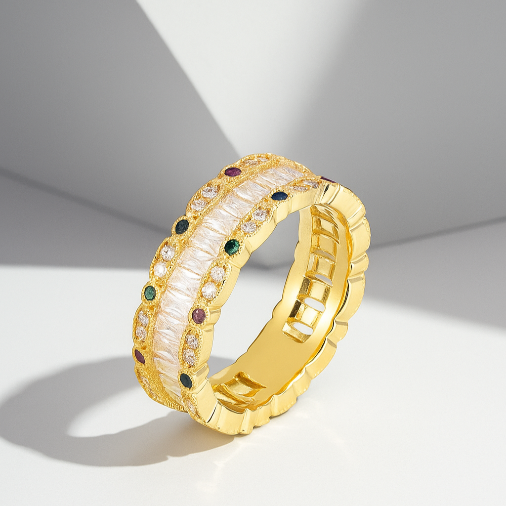 Bold and regal, this intricate band weaves diamonds with vivid gemstones in a rhythmic, crown-like pattern. A celebration of strength and joy, it embodies a life adorned with color, brilliance, and meaning.