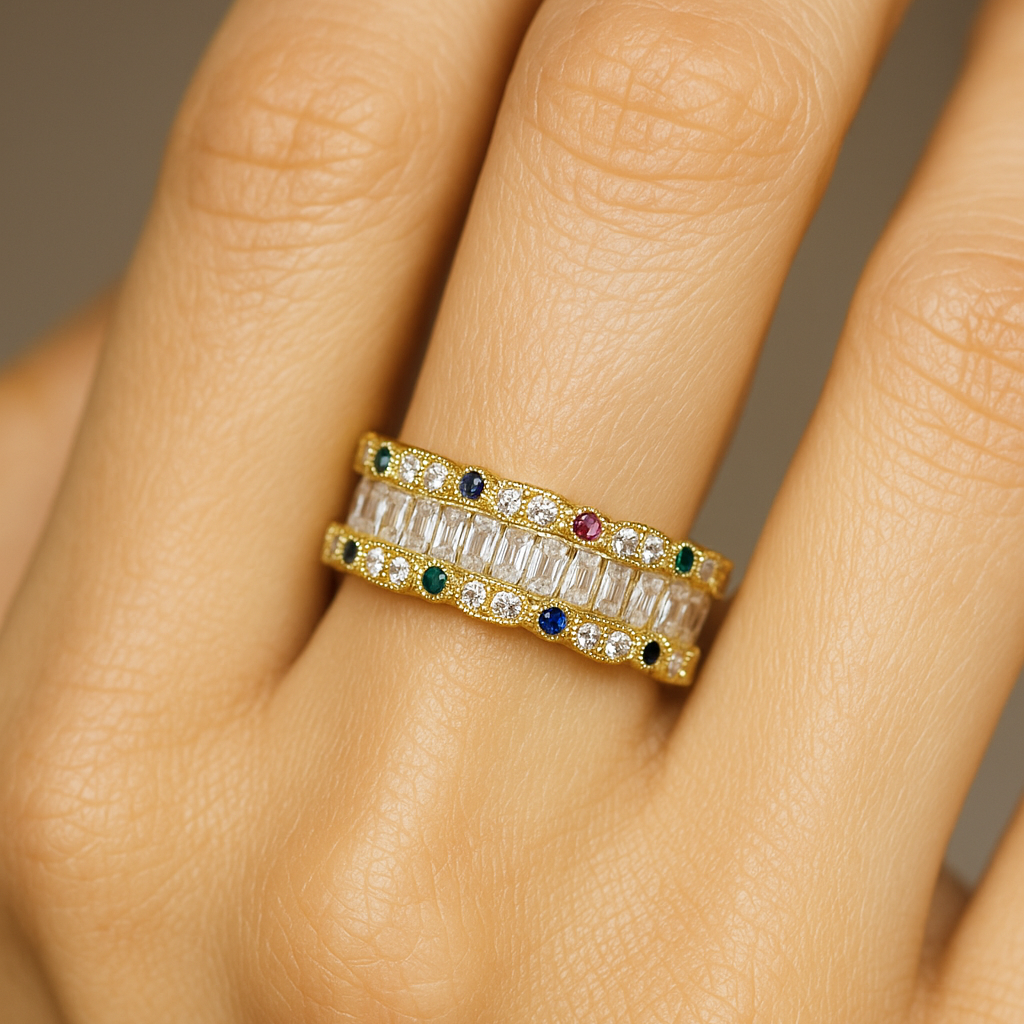 18k yellow, rose, or white gold with bagguette VS1 diamonds and sapphires/emeralds/rubies Bold and regal, this intricate band weaves diamonds with vivid gemstones in a rhythmic, crown-like pattern. A celebration of strength and joy, it embodies a life adorned with color, brilliance, and meaning.
