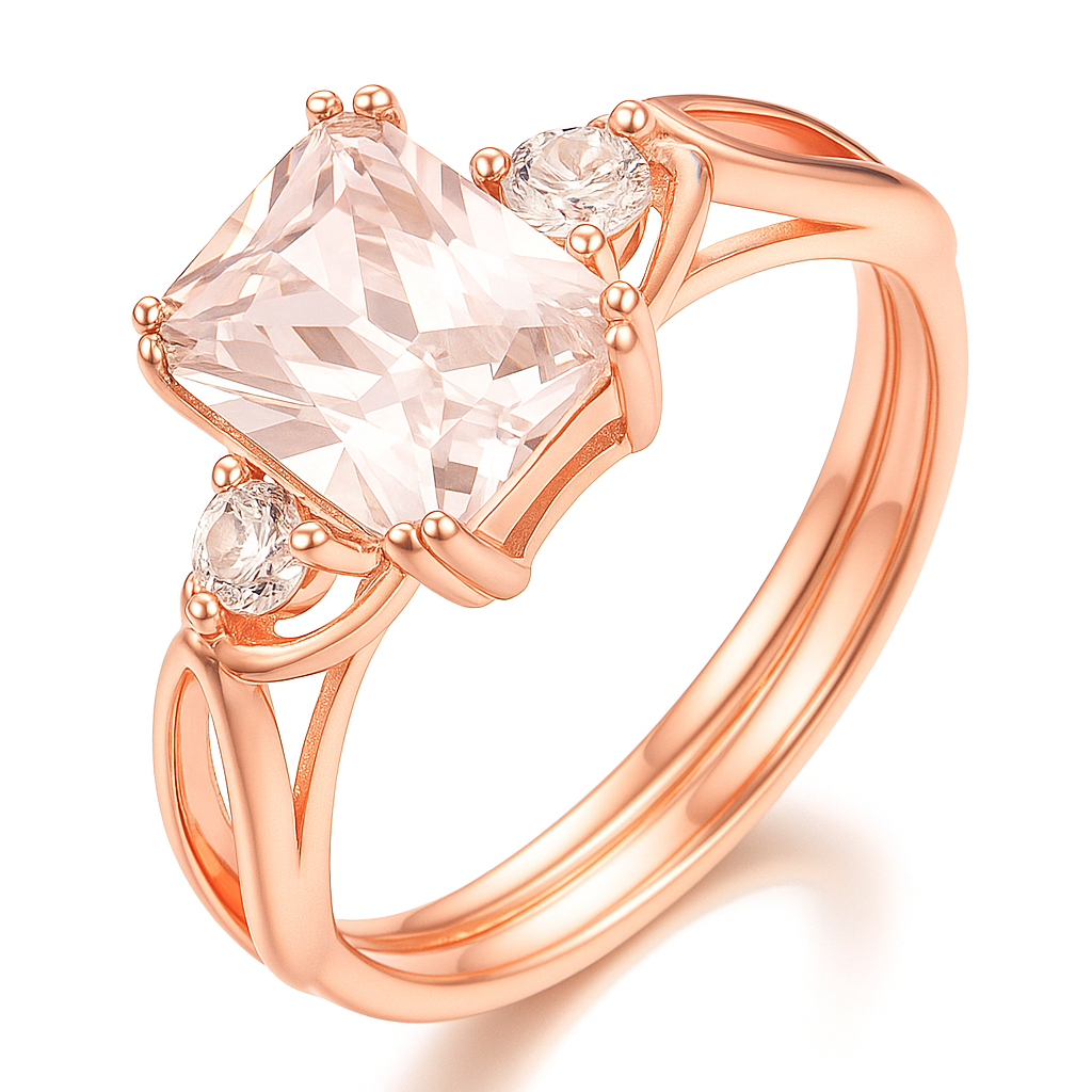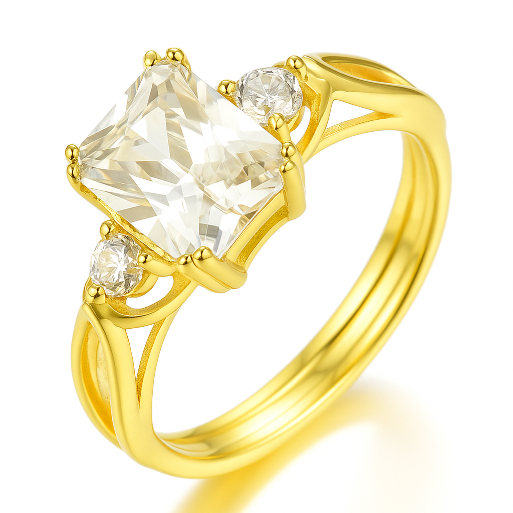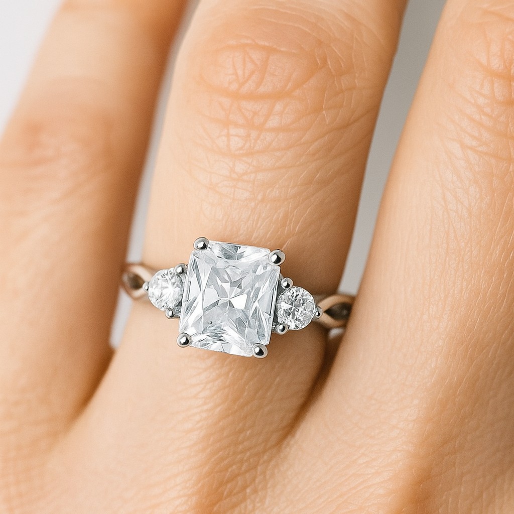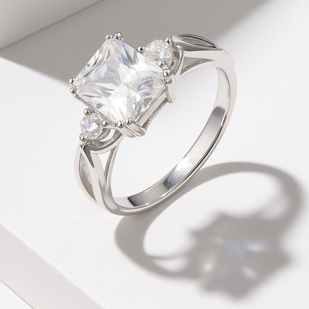 A regal square-cut diamond reigns at the center, framed by twin companions in graceful balance. The openwork setting and fluid band echo royal lineage, a jewel that embodies majesty, legacy, and timeless allure.