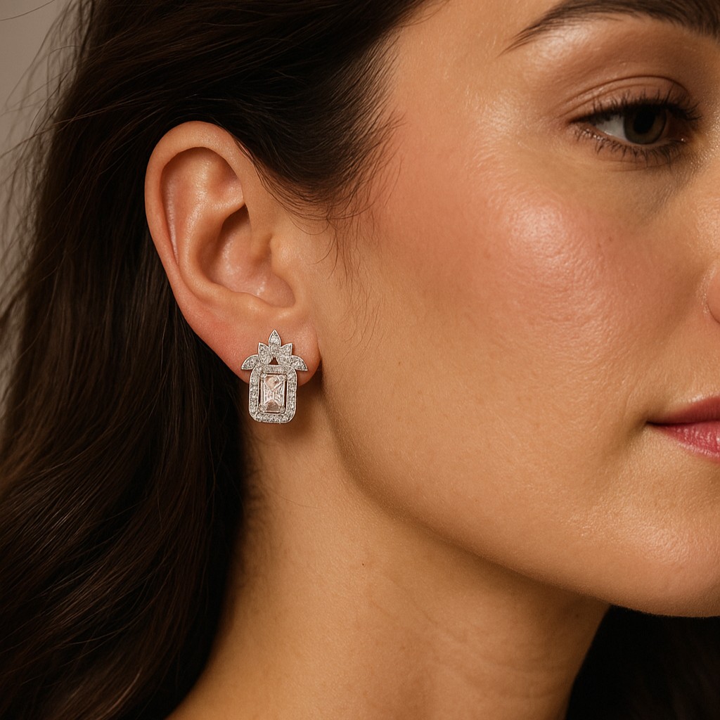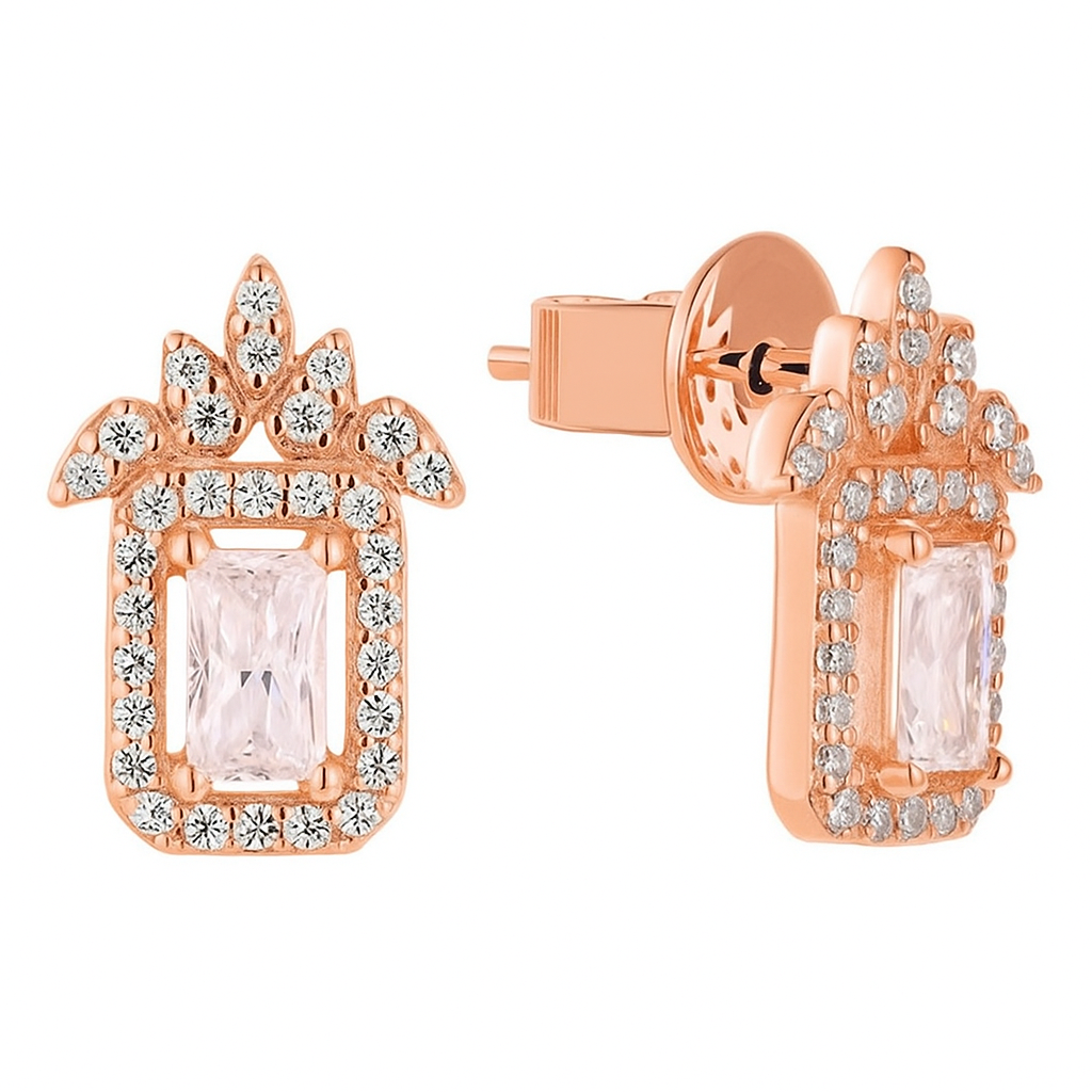 • A statement of vintage grandeur, these earrings feature a rectangular diamond framed with intricate accents and a royal-inspired crest. Perfect for the woman who wishes to carry regal elegance with her every step