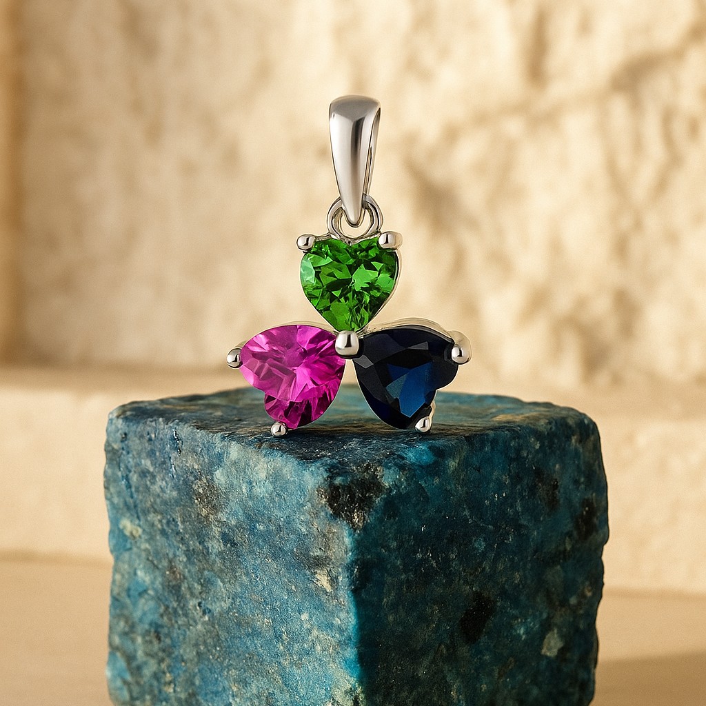 This Vibrant Triple Heart Pendant is a sweet and meaningful piece of jewelry, perfect for showcasing a touch of cheer. Uniquely designed in the form of a three-leaf clover (trifolium), this pendant brings together three captivating heart-shaped synthetic gemstones (or simulants).