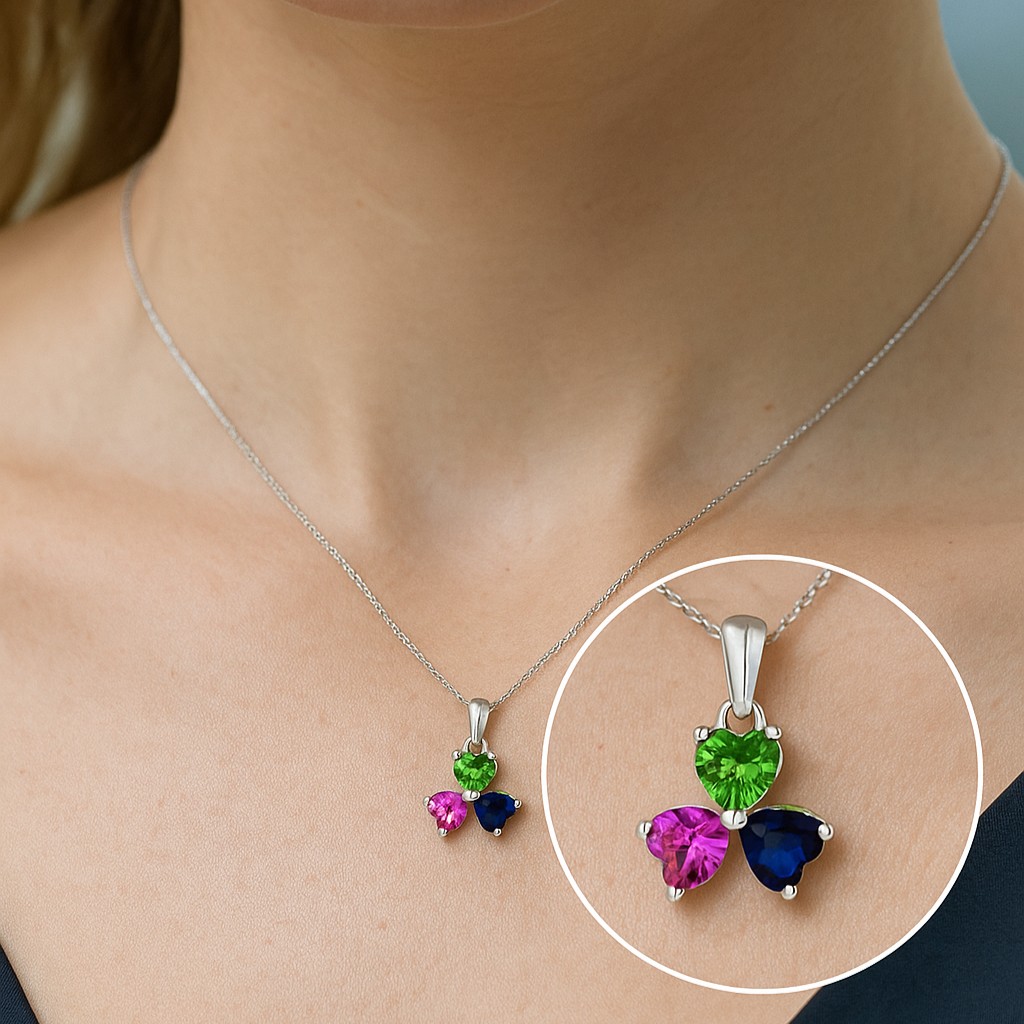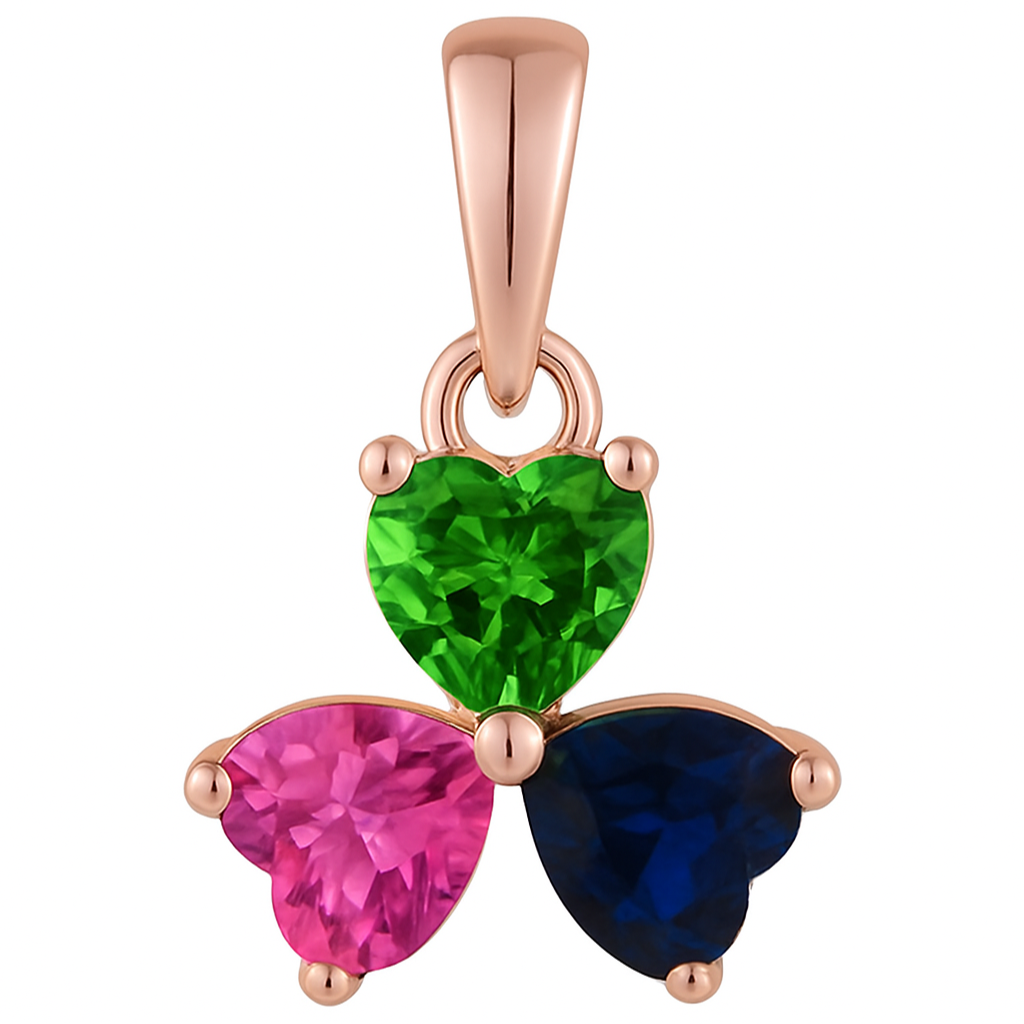 • This Vibrant Triple Heart Pendant is a sweet and meaningful piece of jewelry, perfect for showcasing a touch of cheer. Uniquely designed in the form of a three-leaf clover (trifolium), this pendant brings together three captivating heart-shaped synthetic gemstones (or simulants).