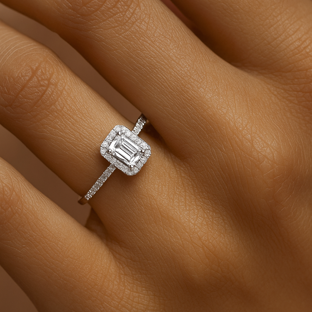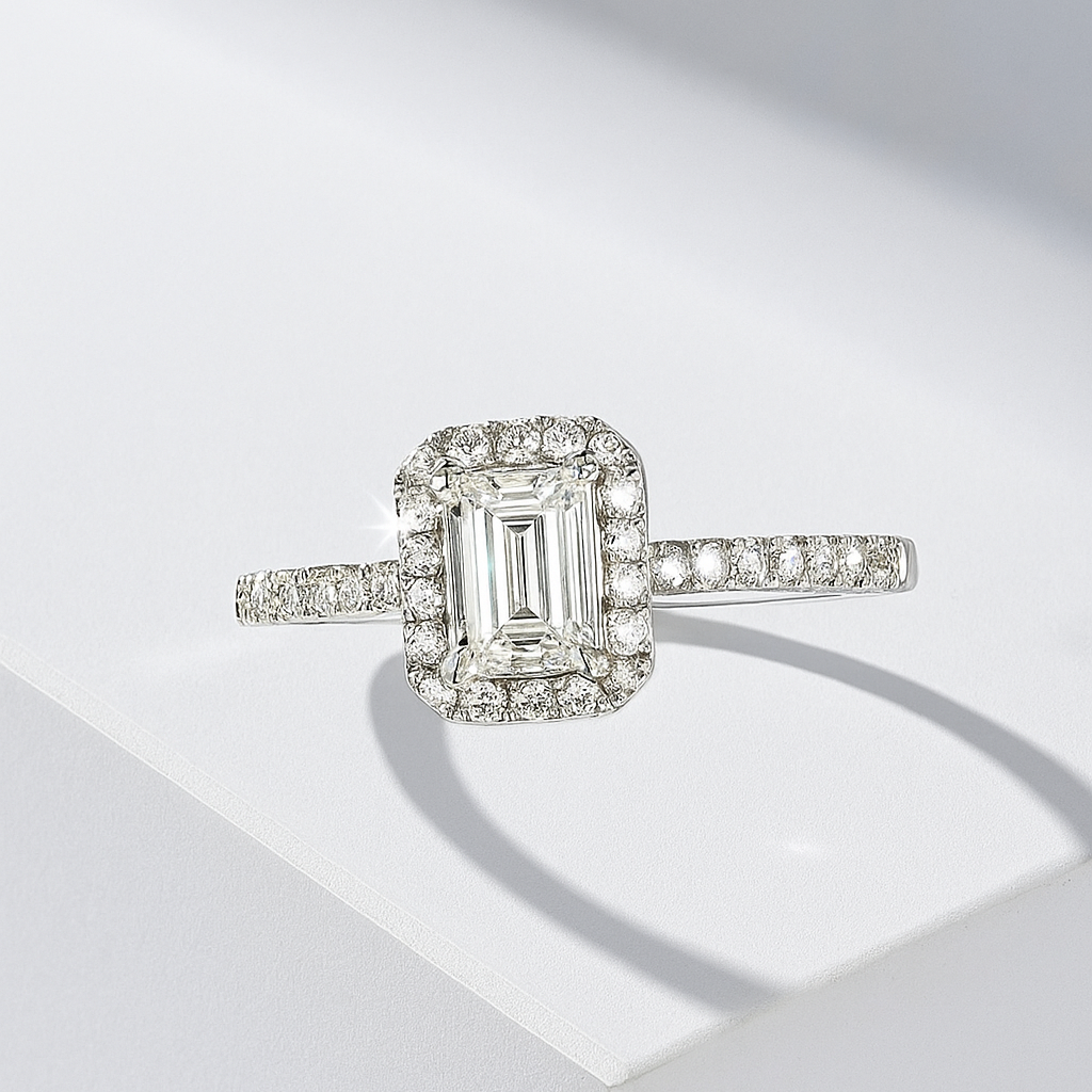 Home “Deco Elegance” Emerald Halo Diamond Ring