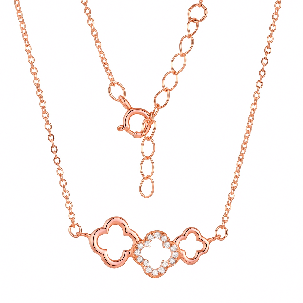 Suspended delicately along a fine chain, this 18K gold necklace features three clover motifs, with the centrepiece encrusted in VS1 diamonds. Available in white, rose, or yellow gold, it is a graceful adornment that sits elegantly along the collarbone, carrying with it the timeless charm of good fortune