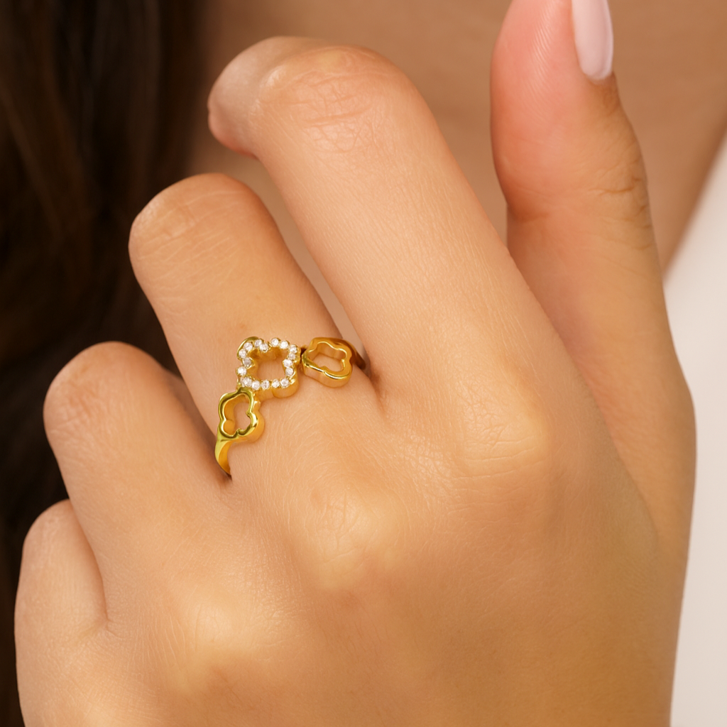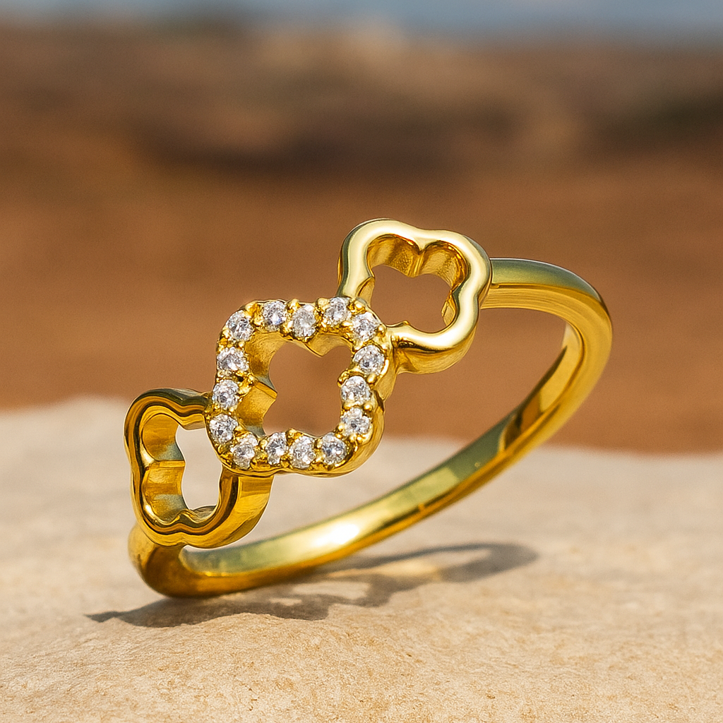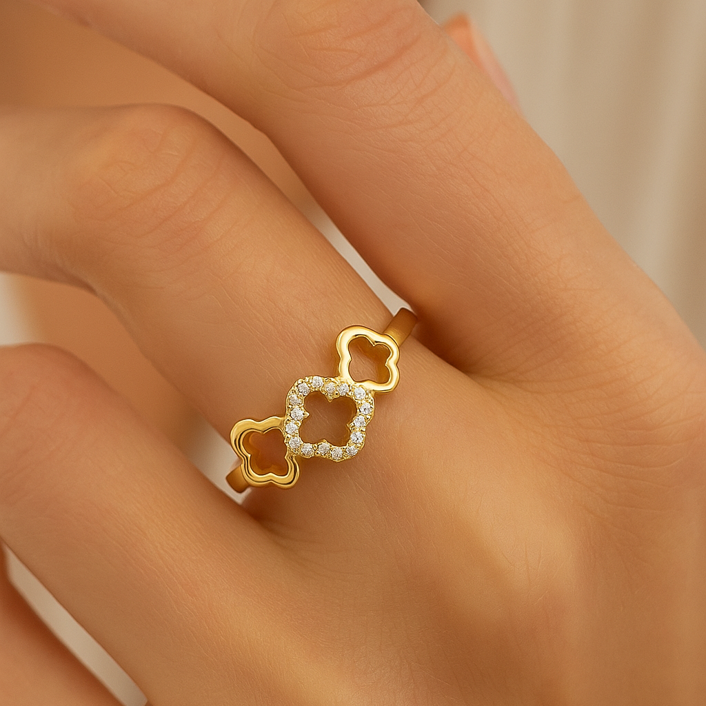 • A contemporary emblem of luck and elegance, this 18K gold ring displays three interconnected clovers, with one radiating the sparkle of VS1 diamonds. Each curve is polished to perfection, making it both a statement of personal style and a timeless symbol of positivity. Available in white, rose, or yellow gold.
