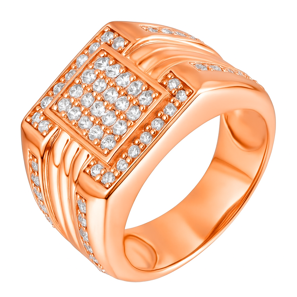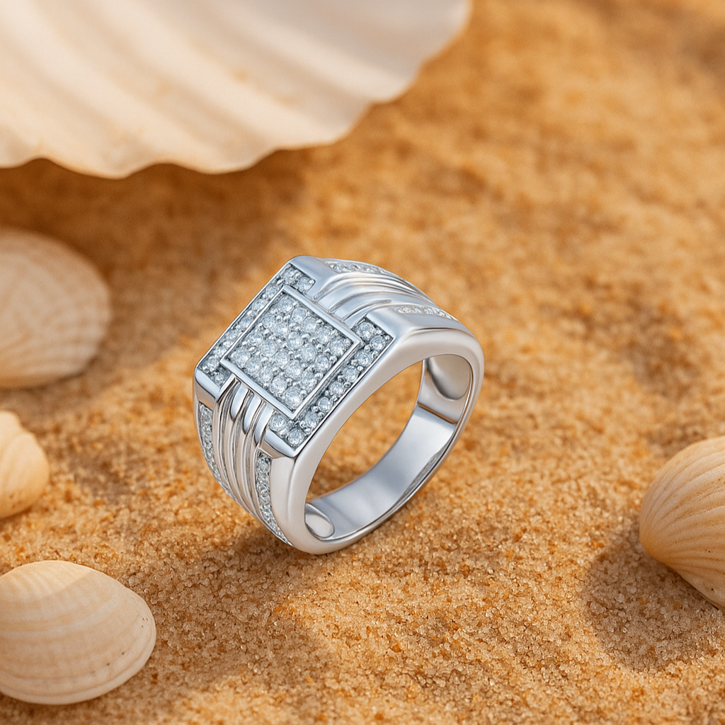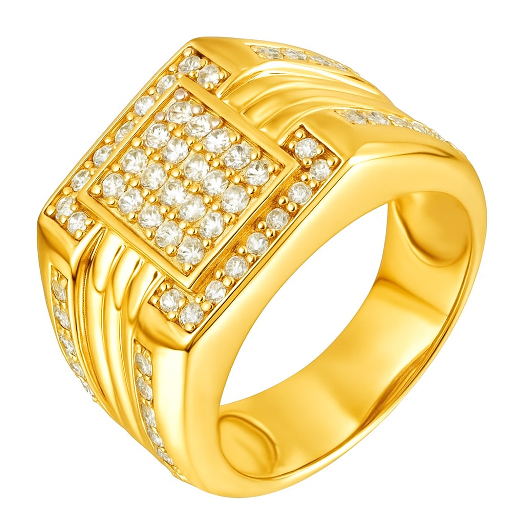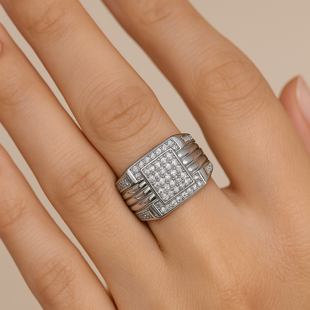 Designed in 18K gold for timeless power and refinement, this men’s ring is set with an array of VS1 diamonds across a square pavé top, accented by sleek engraved lines. A modern classic symbol of strength and success.