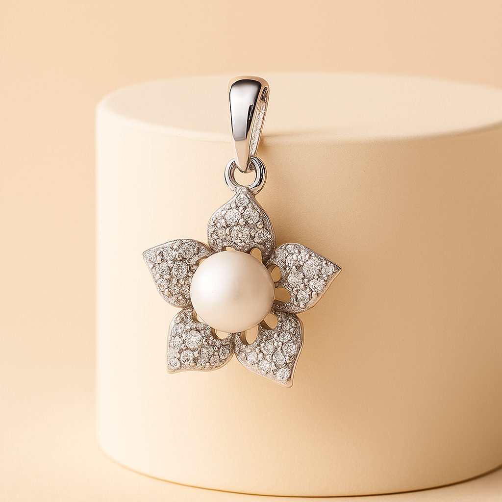 Delicately sculpted in 18K gold — available in white, rose, or yellow — this pendant blossoms with five gracefully curved petals, each adorned with meticulously set VS1 diamonds. At its heart rests a luminous freshwater pearl, symbolising purity and enduring elegance. A piece that captures the beauty of nature in its most perfect moment of bloom.