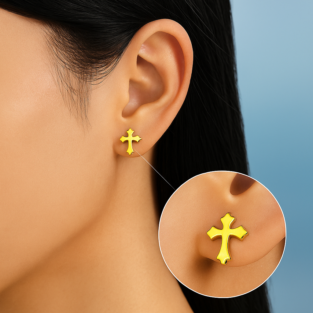 • Radiating quiet sophistication, the Divine Grace Gold Cross Ear Stud celebrates both spirituality and style. Meticulously polished to perfection, its 0.7mm × 0.9mm silhouette shines with a refined golden glow that feels powerful yet graceful. Designed for the modern soul who values meaning in every detail, this piece embodies elegance that transcends trends — a subtle statement of faith, beauty, and confidence.