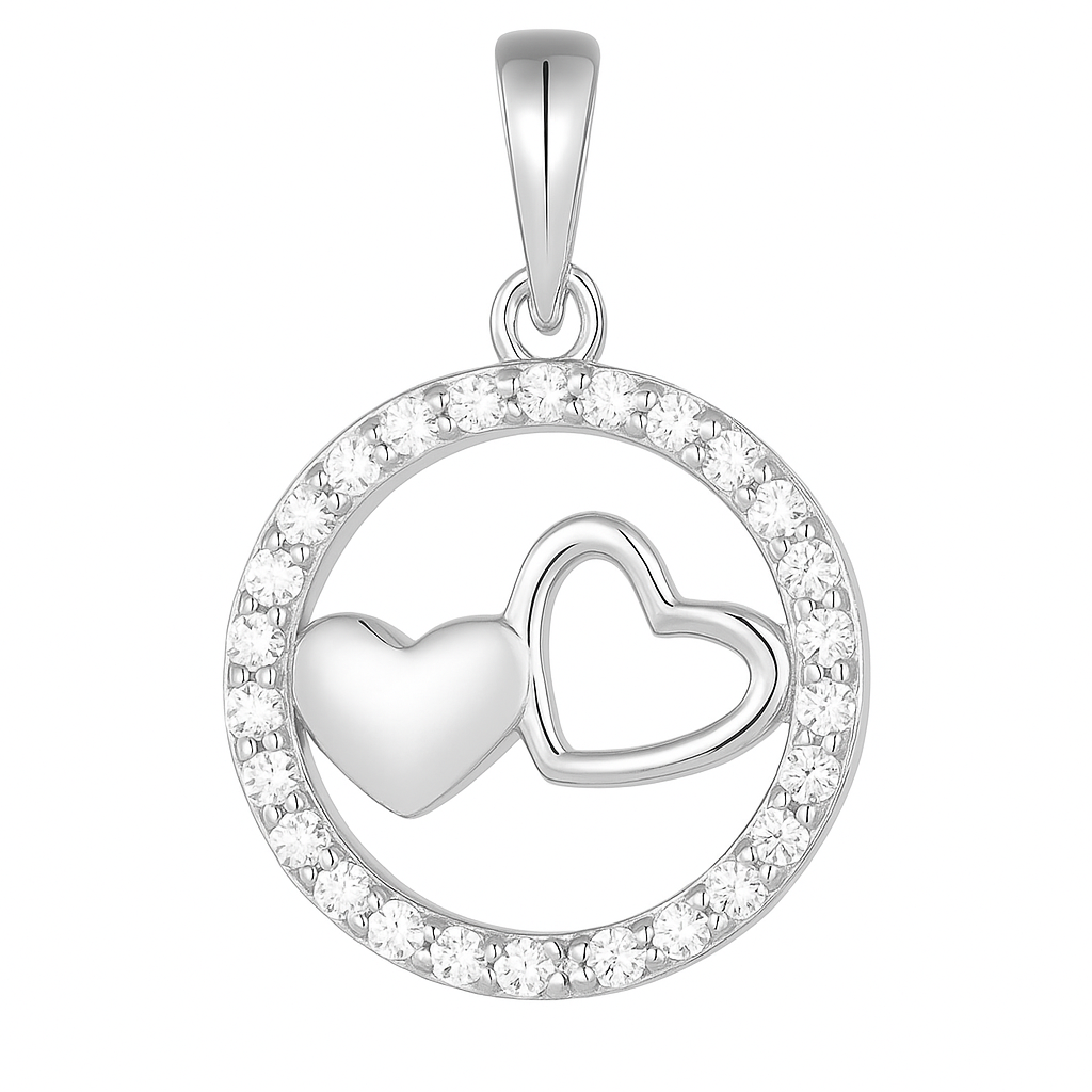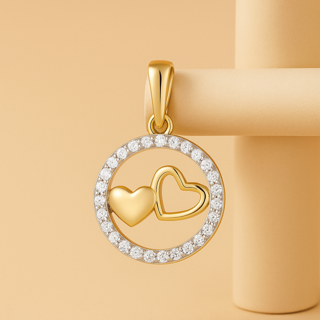 Two hearts intertwined within a diamond-studded circle, this 18K gold pendant (available in white, rose, or yellow) captures the essence of eternal love and unity. The brilliance of VS1 diamonds enhances its romantic symbolism, making it a timeless emblem of devotion.