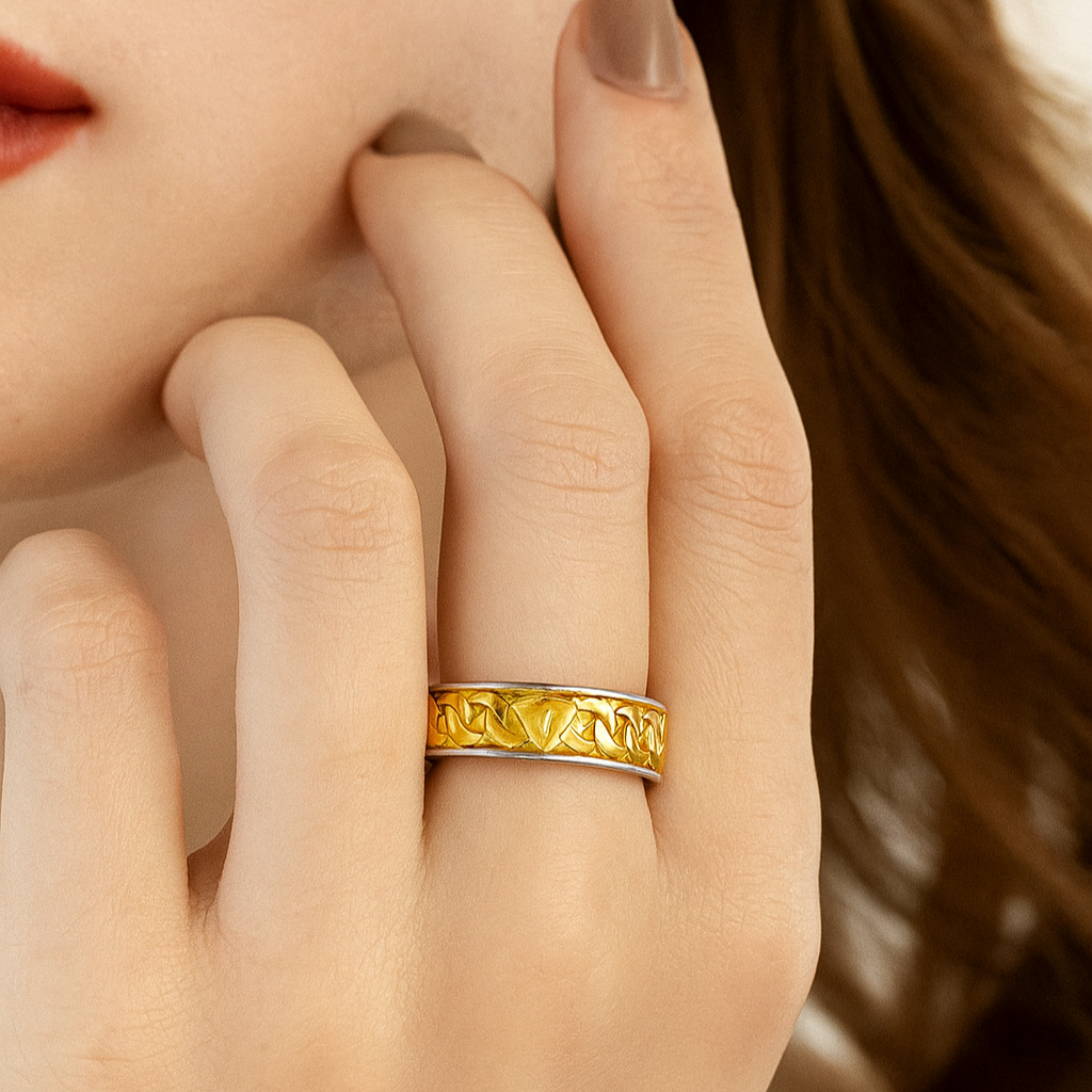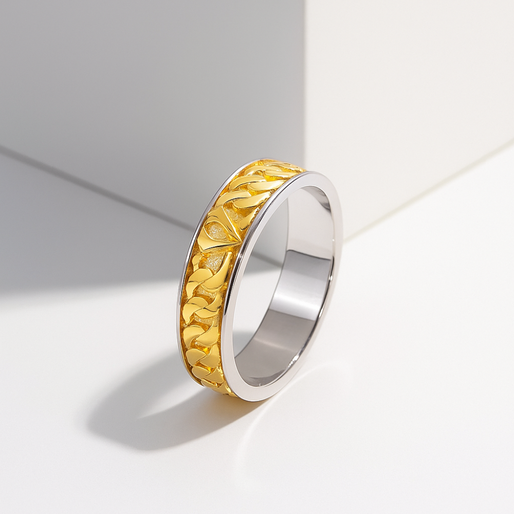 A seamless fusion of strength and refinement, this band features a golden chain embraced by sleek white gold edges. Symbolizing unity and resilience, it is both modern and eternal — a statement of enduring legacy.
