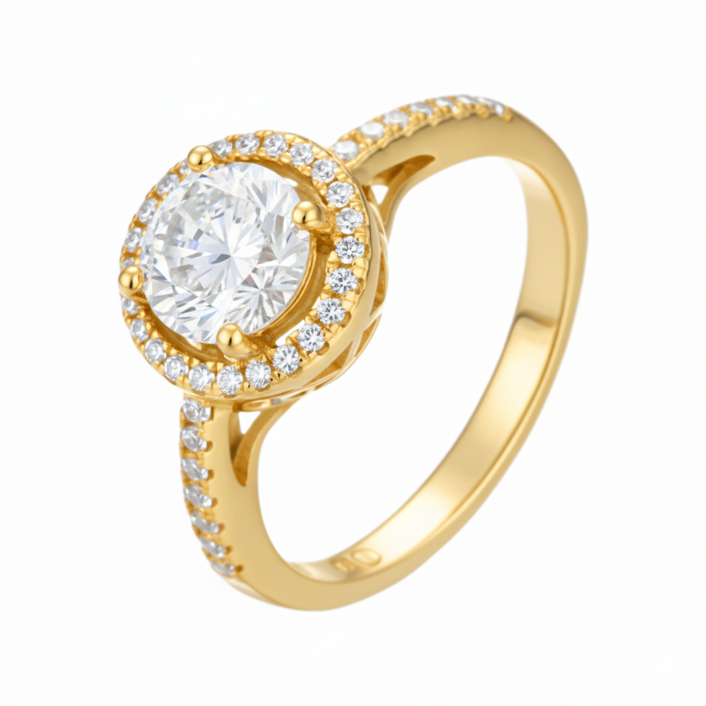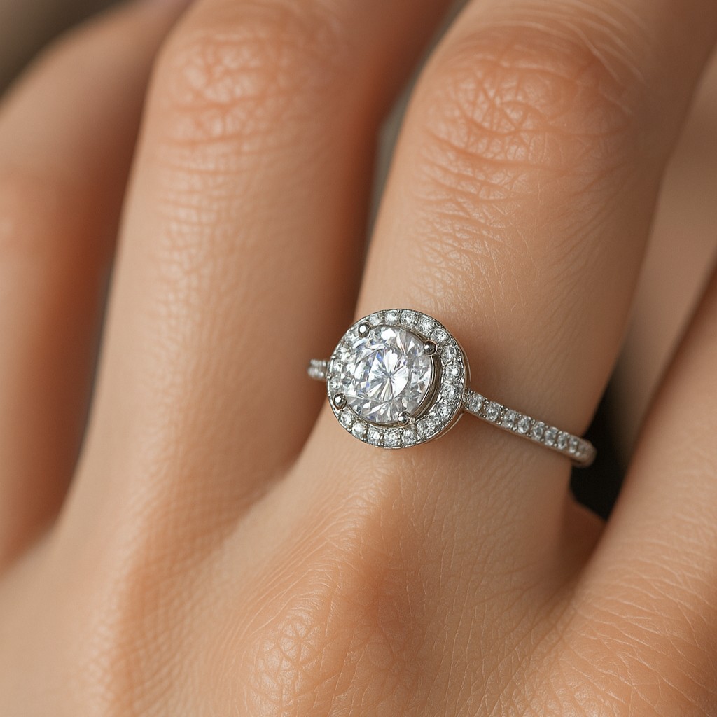 A bold bezel halo envelops the brilliant round stone, magnifying its fire and protecting its beauty. Pavé shoulders sweep towards the centerpiece, symbolizing arms encircling love itself. For the bride who values both modernity and tradition, this design embodies strength wrapped in romance.