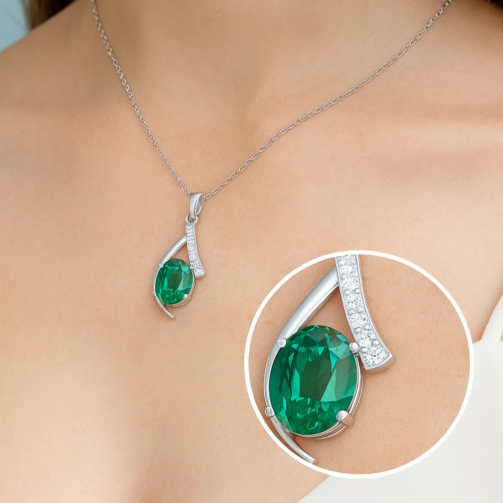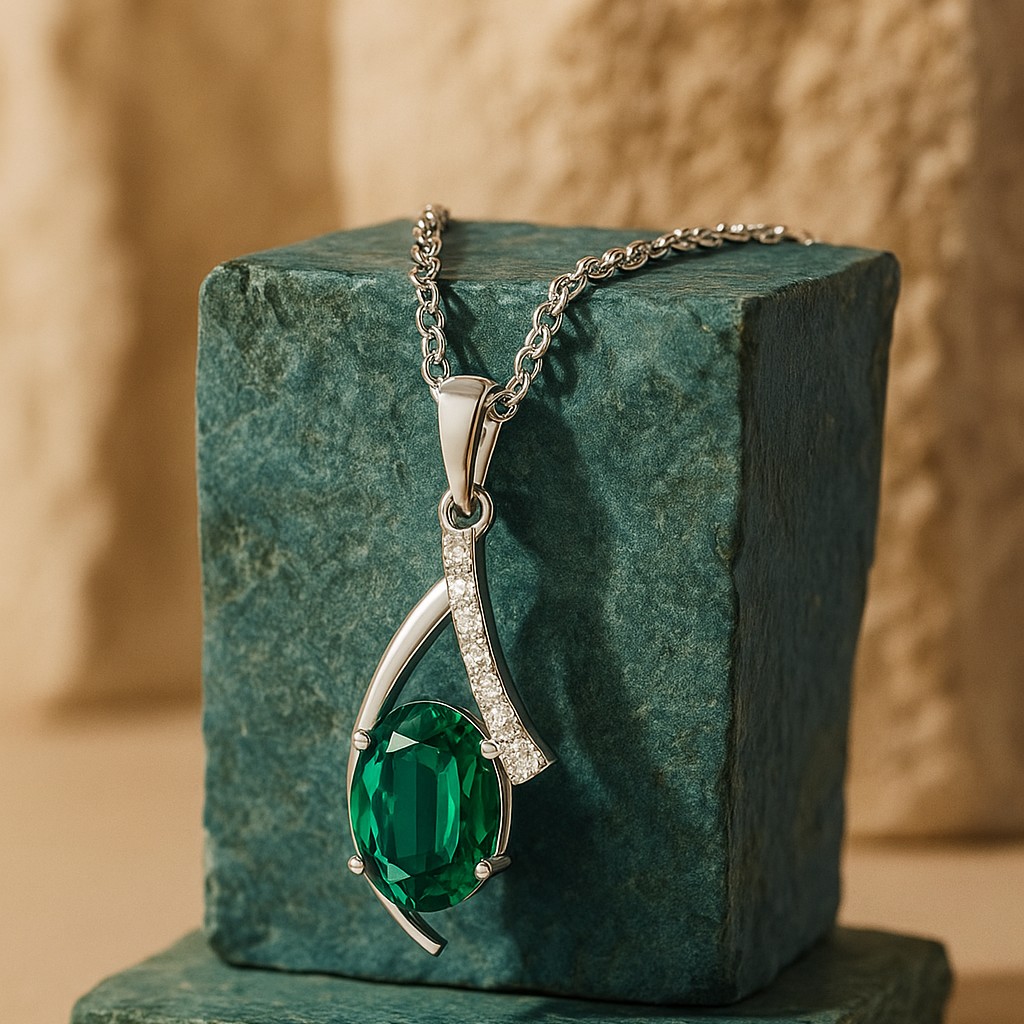 • An oval emerald rests in a graceful contemporary setting, accented by a gentle arc of diamonds. The design suggests poised movement—like a dancer caught mid-turn—capturing both vitality and sophistication. A jewel for those who live with grace and vibrance.